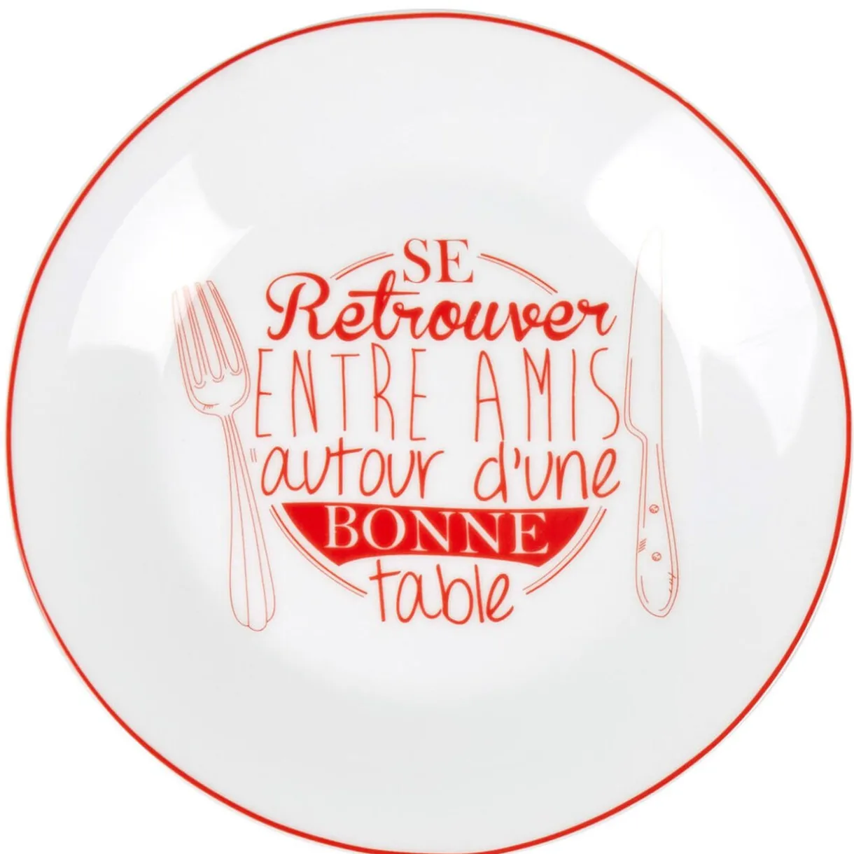 Assiette à dessert blanche et rouge avec inscription « se retrouver entre amis autour d’une bonne table ».