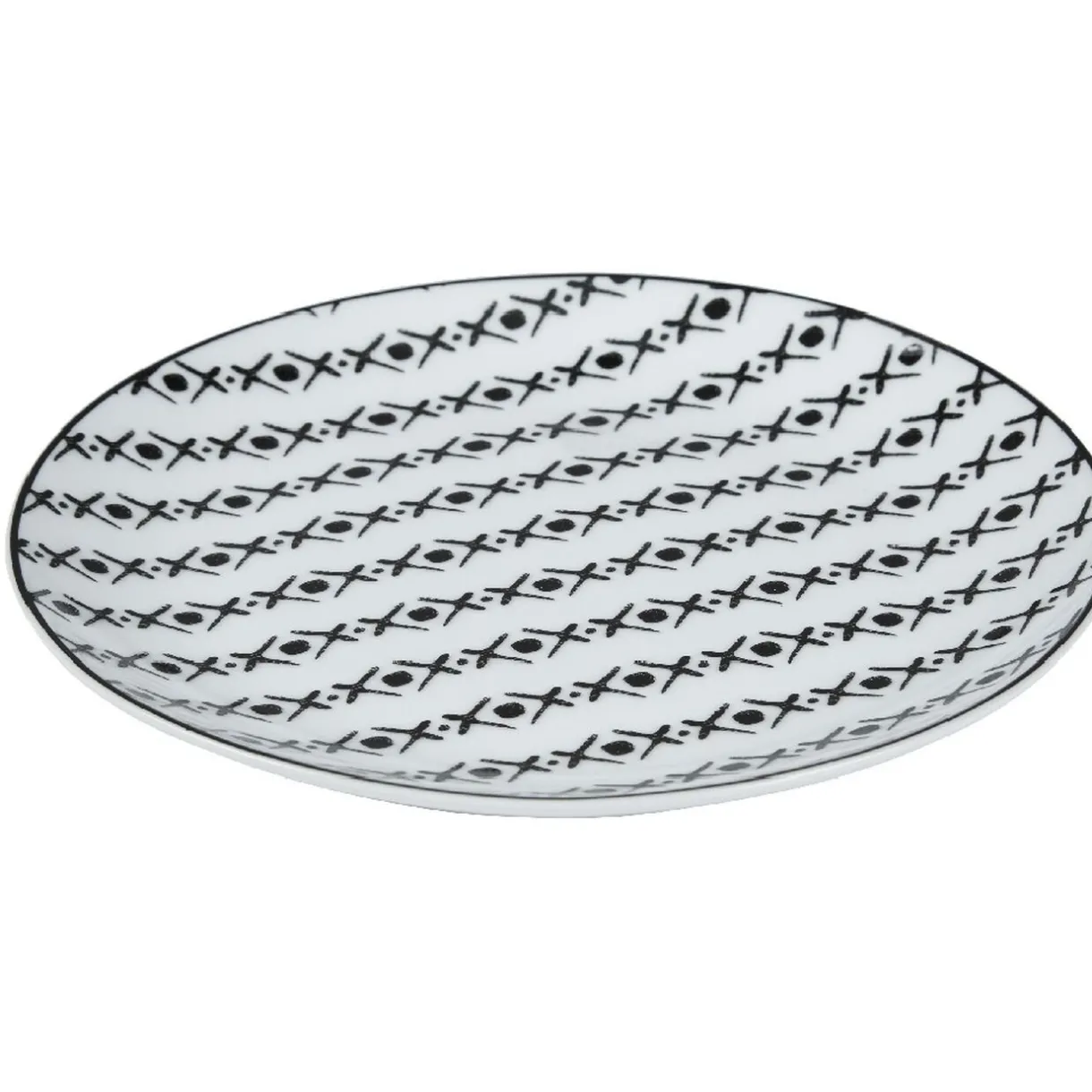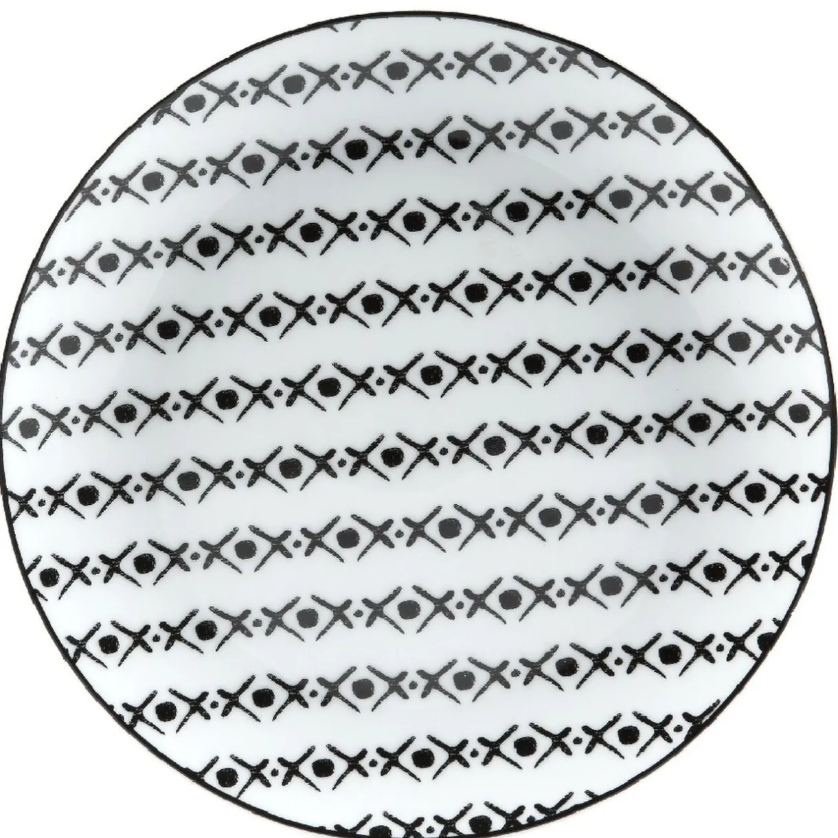 Soyez original dans votre dressage de table avec cette assiette à dessert ronde de couleur blanche motifs croix noires en ligne.