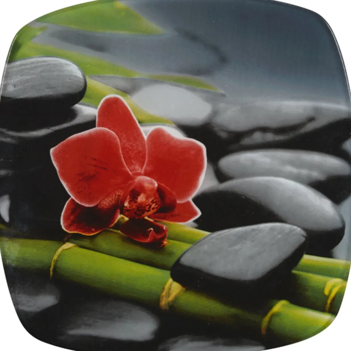 Assiette à dessert design galets noirs, branches de bambou et fleur rouge, dim. 20×20 cm, verre.