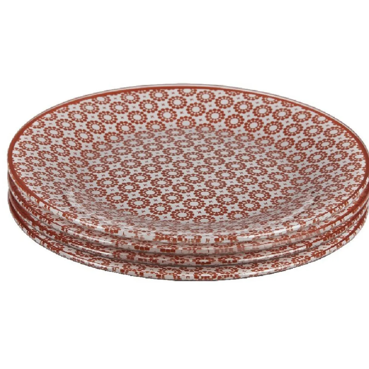 4 assiettes à dessert Micro de couleur blanc, motifs pois en forme de fleurs rouges.