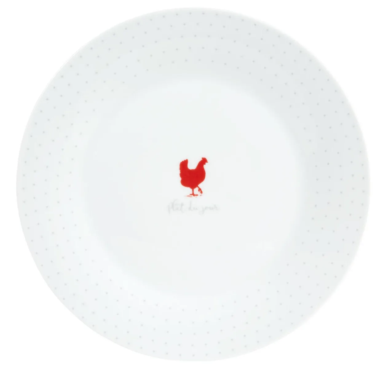 4 assiettes plates blanches, motif poule rouge et points gris.