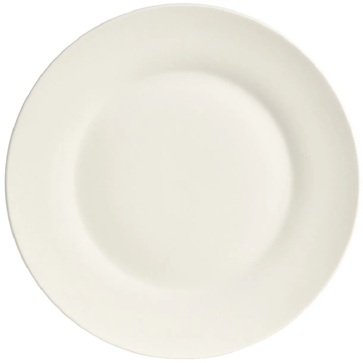 Assiette plate en porcelaine, de couleur blanche et de forme ronde.