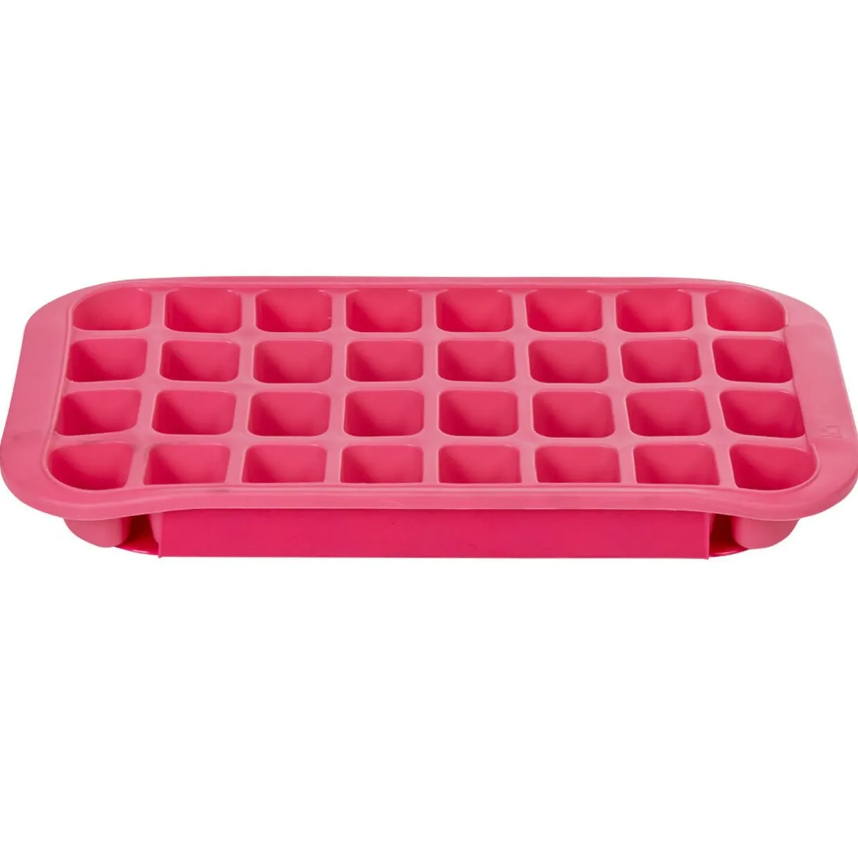 Bac à glaçons 32 compartiments, en plastique de couleur rose.