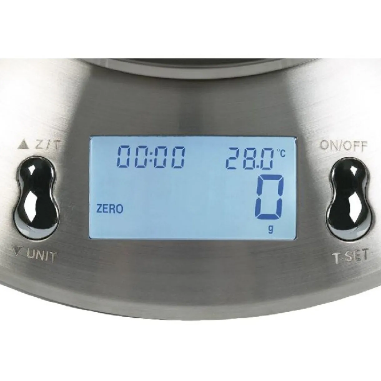 Balance de cuisine électronique, dim. 21×14 cm, poids maximal 5 kg, précision au gramme, fonction tare, minuterie, inox, fonctionne avec 1 pile 9 V non fournie.