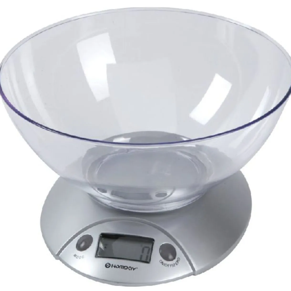 Balance de cuisine électronique avec pesée max 5 kg, precision +/-1g, affichage LCD, arrêt automatique, fonctionne avec 1 pile CR2032 fournie..