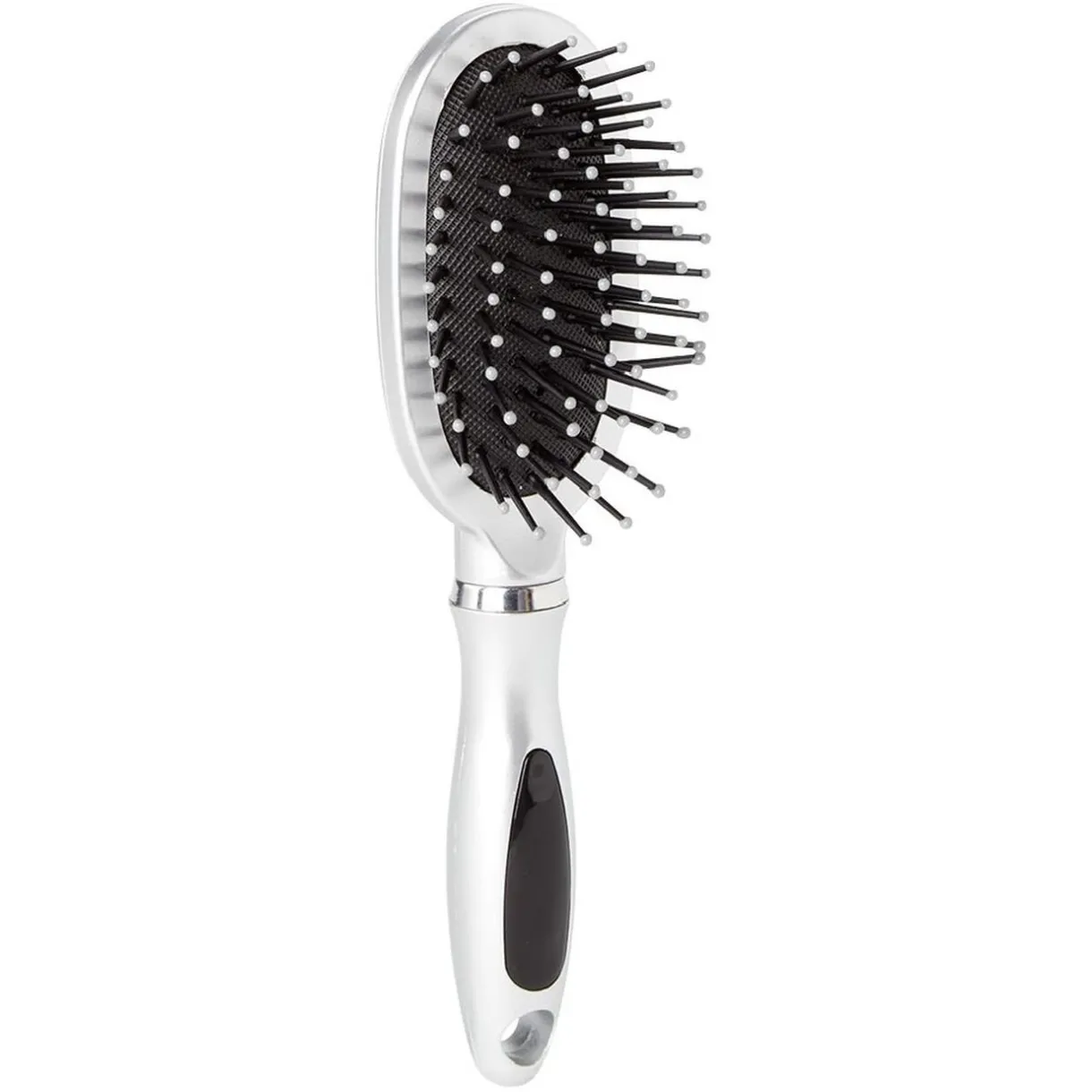Brosse pneumatique ovale avec picots en pvc noir perlés. Format compact pour sac.