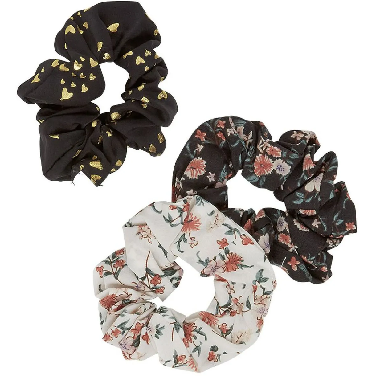 Lot de 3 chouchous à motif fleurs et coeurs pour attacher vos cheveux en queue de cheval ou en chignon.
