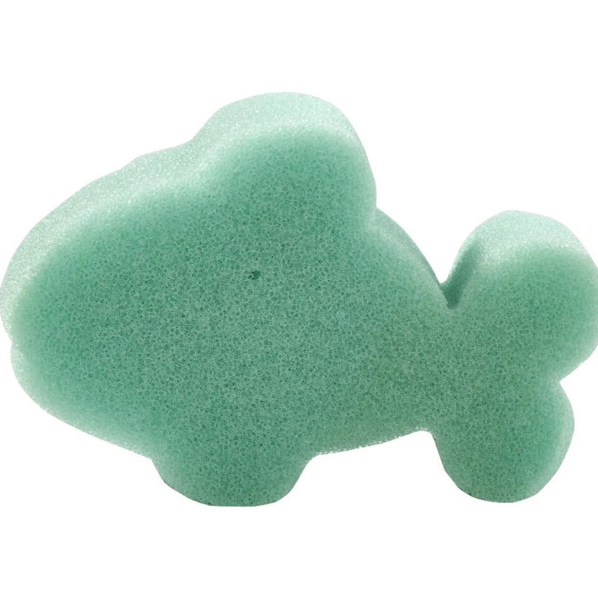 Lot de 4 éponges de bain en mousse de différentes formes et colorées jaune, vert, rouge et rose.