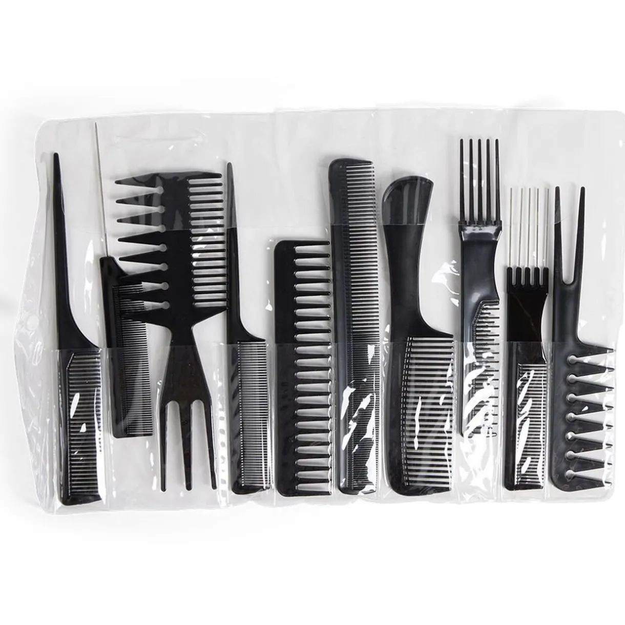 Cet ensemble comprend 10 peignes en plastique de formes variées, offrant une solution polyvalente pour tous les types de cheveux.