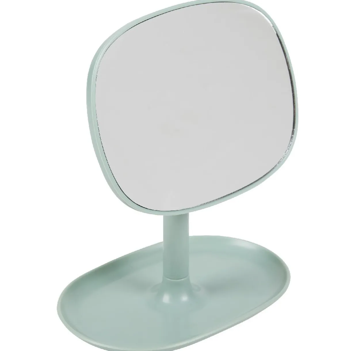 Miroir POP inclinable de couleur bleu sur pieds pouvant faire office de repose bijoux ou accessoires.