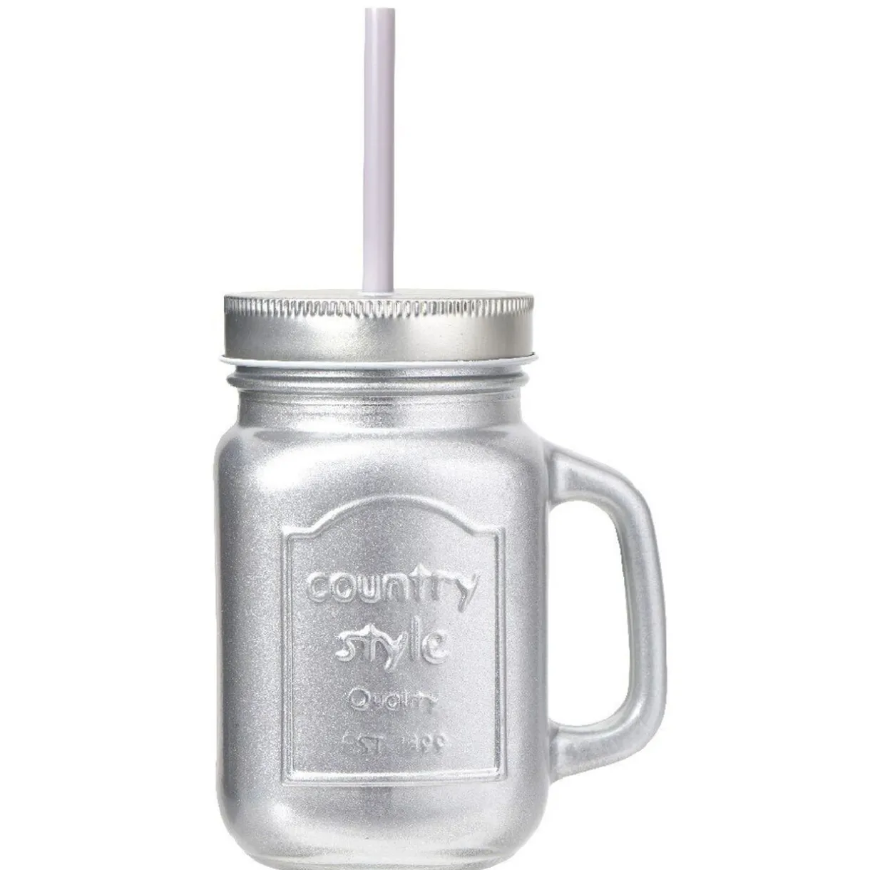 Bocal avec paille argenté 460 ml, verre, dim.11 x 13.5 x 8.5 cm