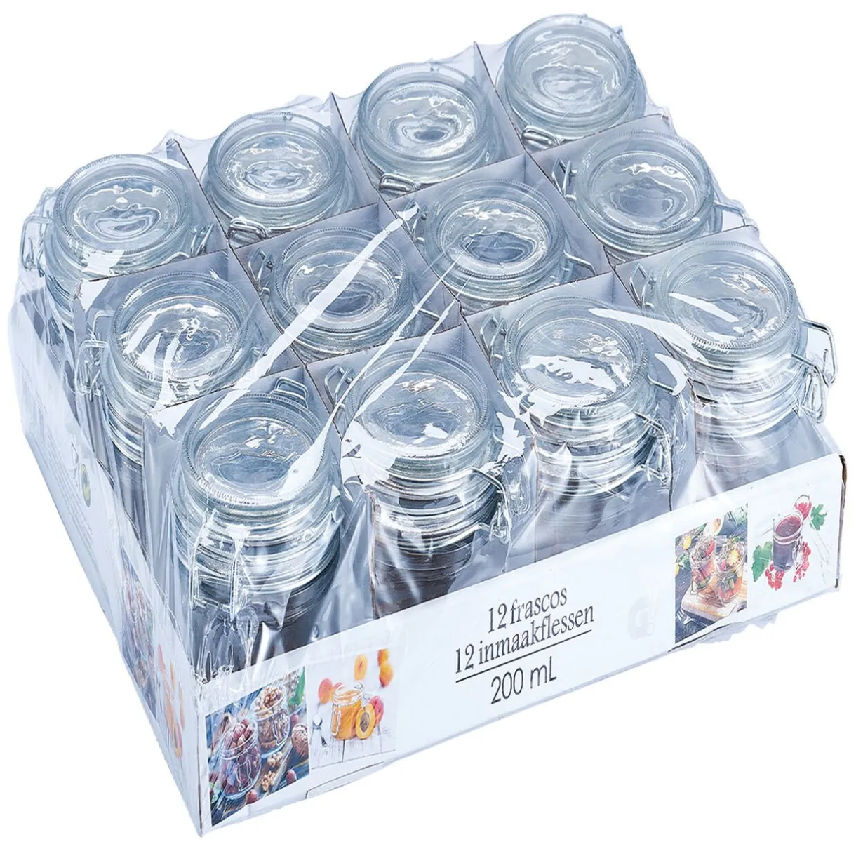 Lot de 12 bocaux en verre transparent et à fermeture hermétique.