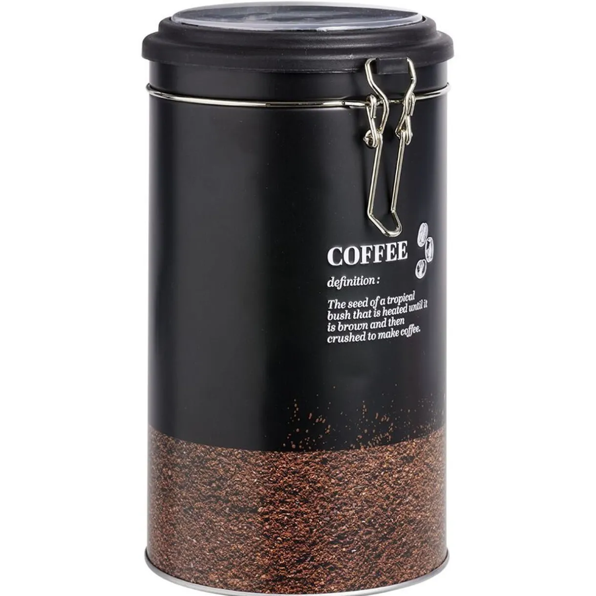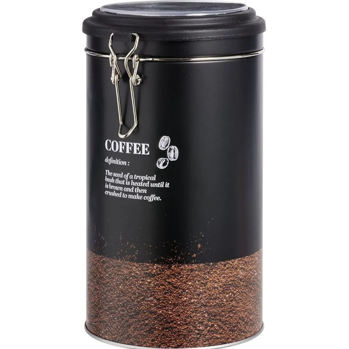 Cette jolie boîte en métal avec couvercle en plastique et fermeture clip sera parfaite pour conserver votre café moulu ou en grains. Pratique et déco avec son design original sur fond noir, elle apportera du style à votre rangement de cuisine.