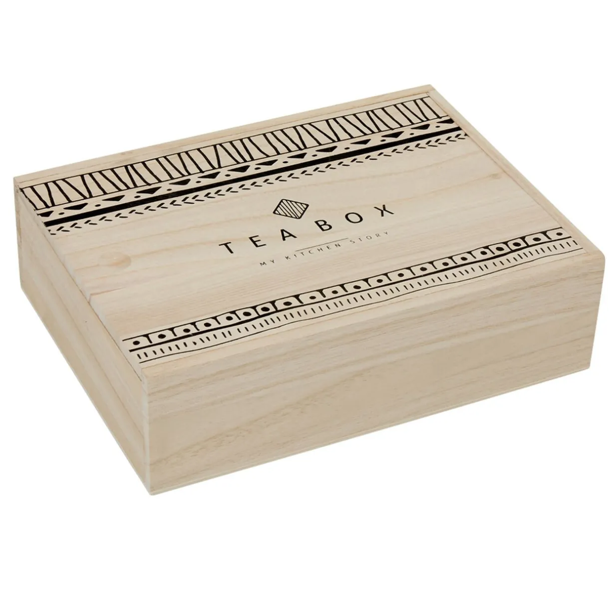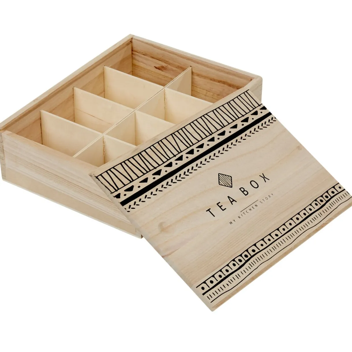 Optez pour cette jolie boîte à thé en bois MDF (panneau de fibres de bois) naturel avec couvercle coulissant imprimé déco noir. Elle somprend 8 compartiments pour la conservation optimale de vos différents thés.