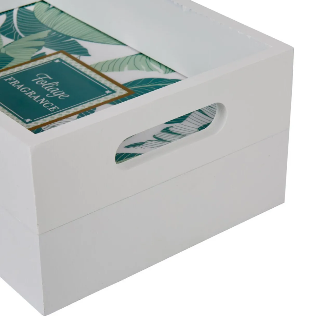 Boite blanche et design feuillage tropical.