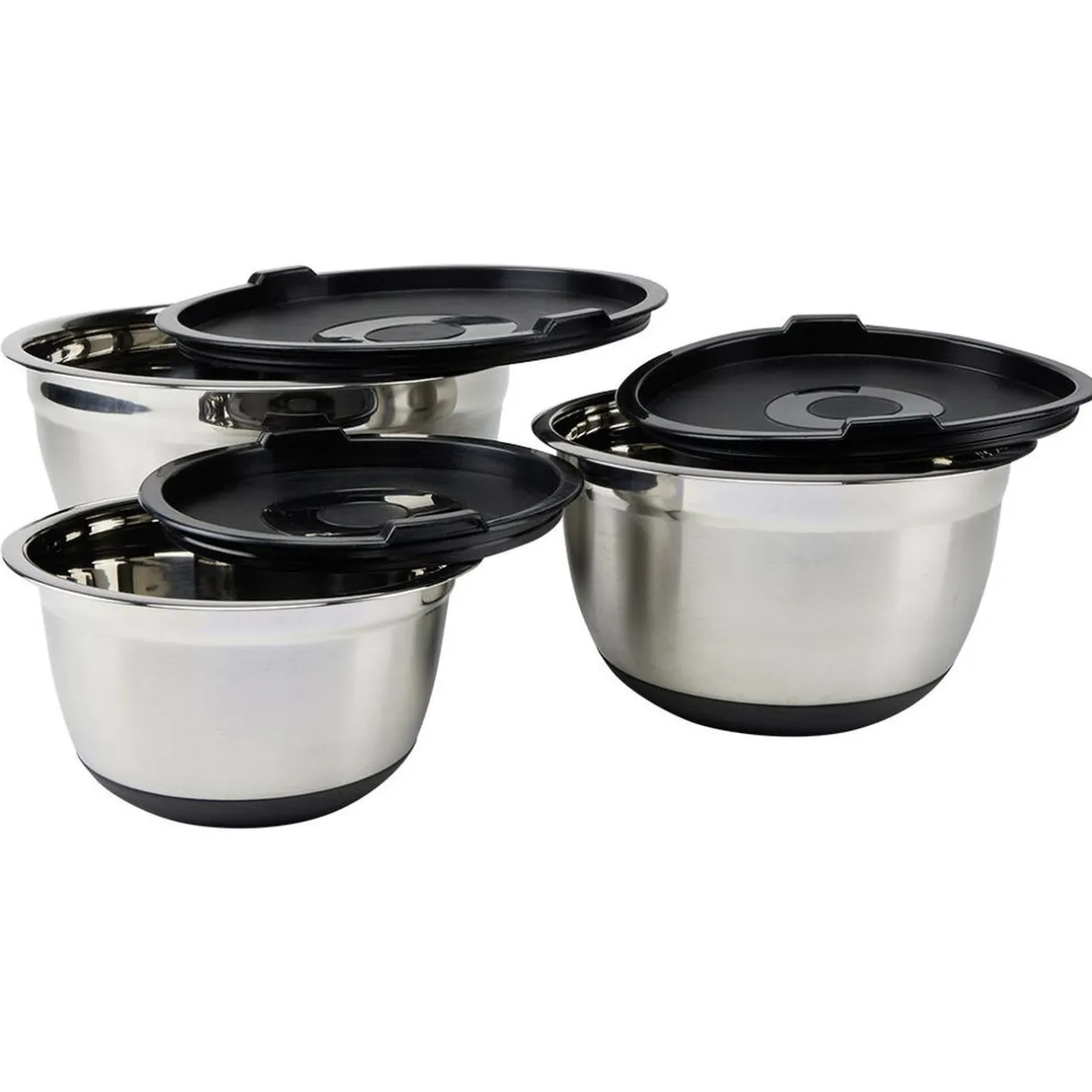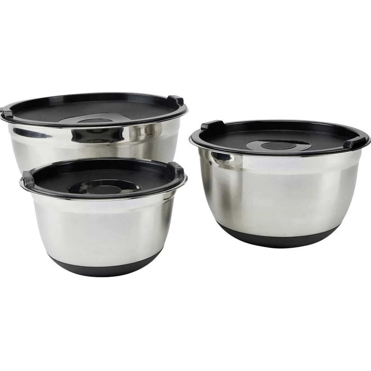 Lot de 3 bols à mixer en inox avec base antidérapante en silicone noir.