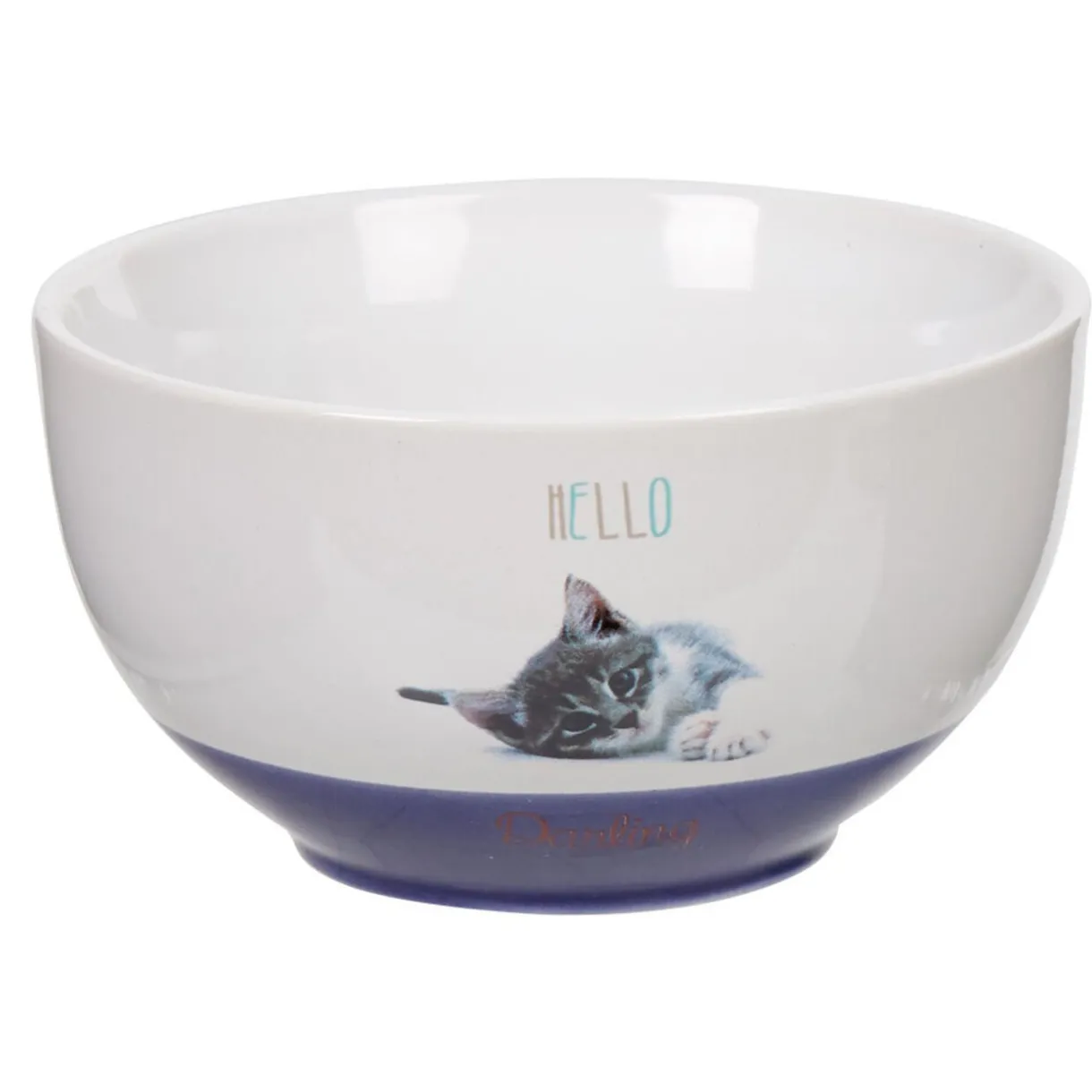Bol en faïence bicolore blanc et bleu avec imprimé chat.