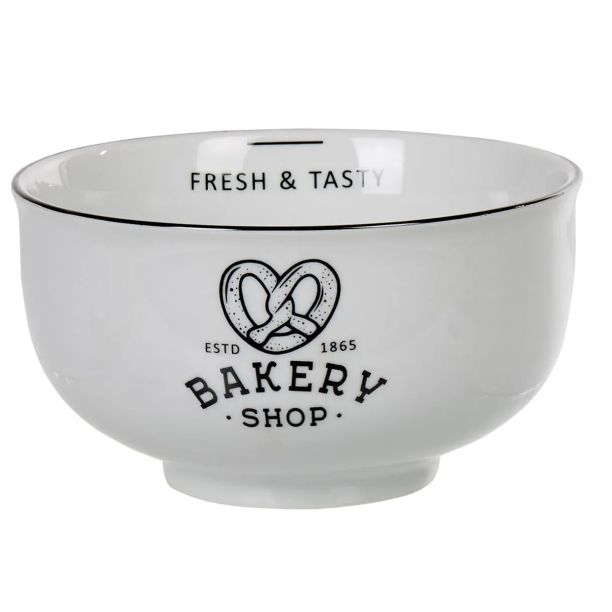 Ambiance conviviale dès le réveil avec ce bol décoré d’un appétissant bretzel et des inscriptions « bakery shop » (boulangerie) et « fresh and tasty » (frais et savoureux).