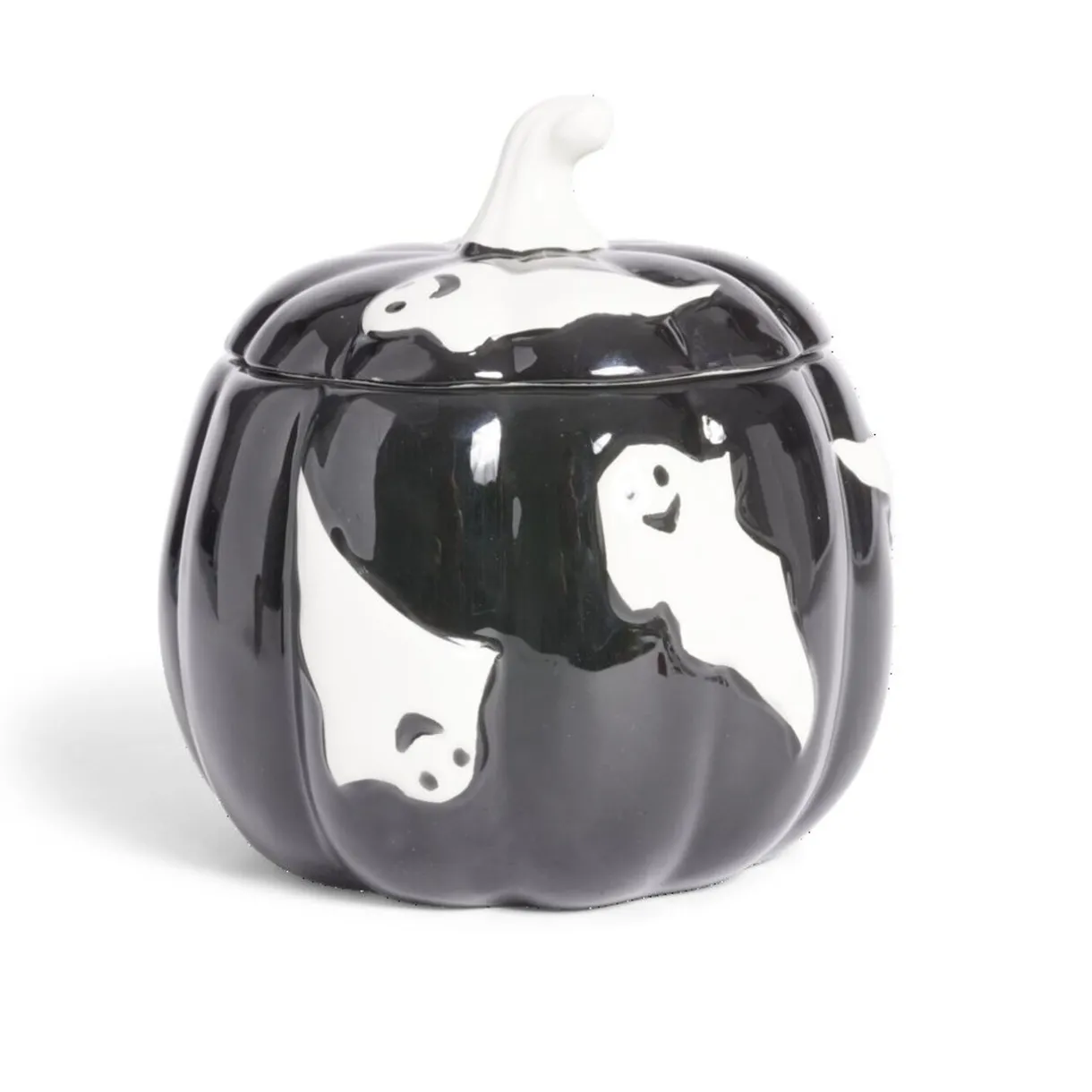 Capturez l’esprit d’Halloween avec cette bonbonnière en forme de citrouille noire agrémentée de fantômes blancs.