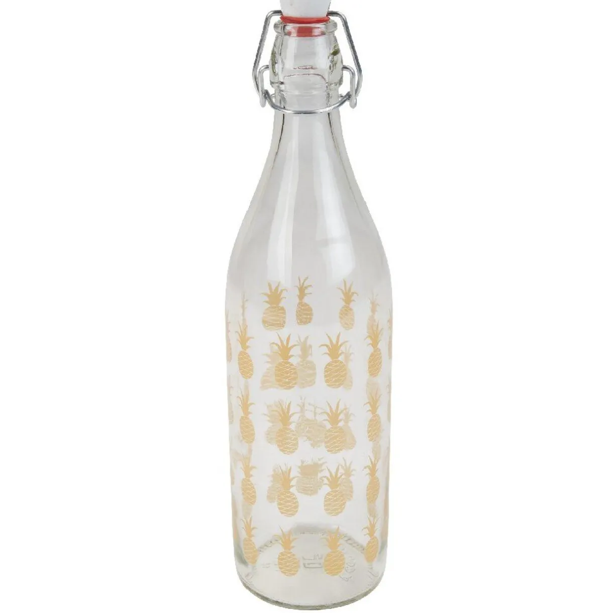 Bouteille en verre Officina d’une contenance de 1 litre, avec bouchon blanc clipsable, style tropical avec petits motifs ananas dorés sur le contour.