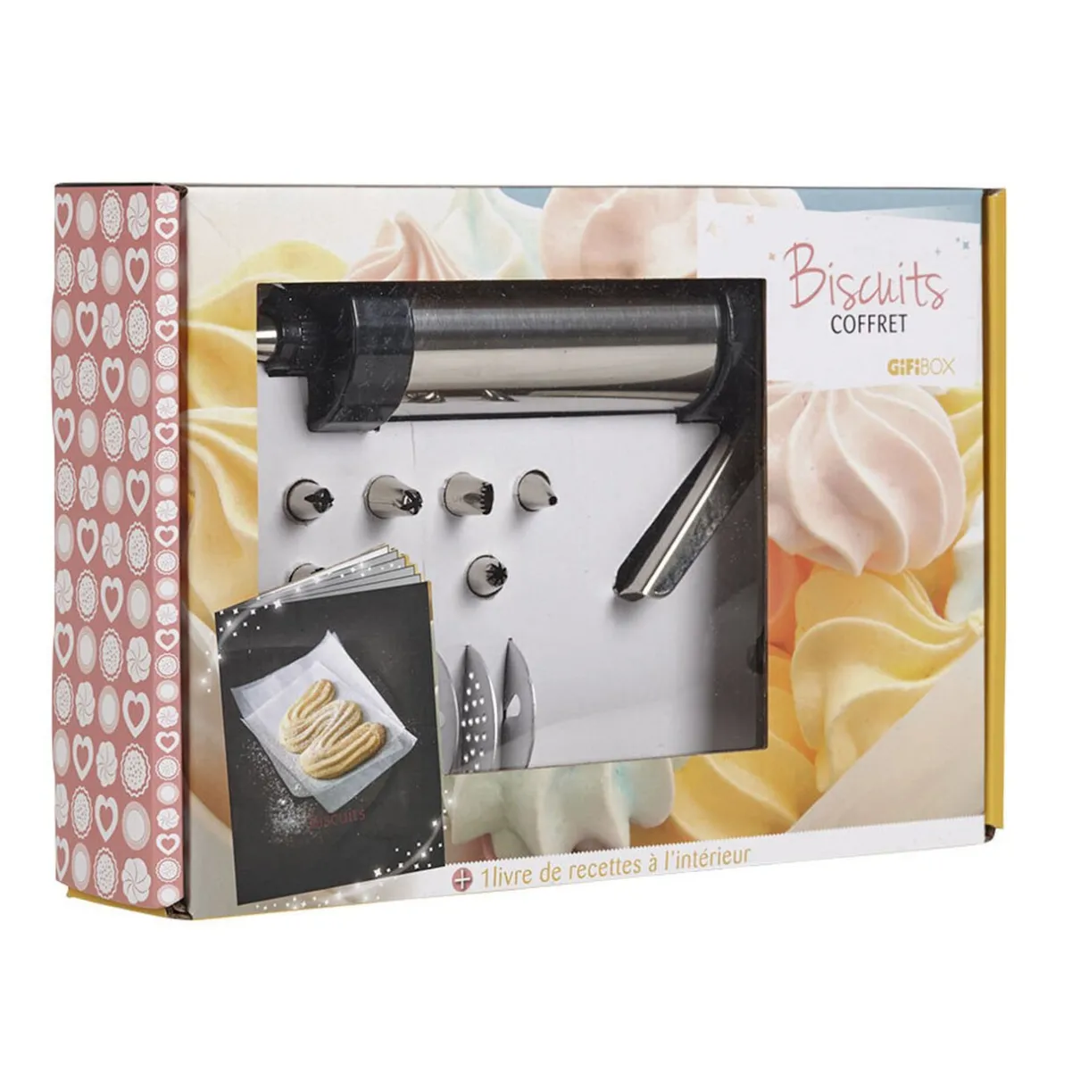 Tel un professionnel, épatez votre entourage en préparant rapidement et simplement de délicieux petits gâteaux grâce à cette presse à biscuit en inox. Une fois remplie de pâte, une simple pulsion sur la poignée suffit à « libérer » la dose exacte pour réaliser l’une des 8 formes proposées. Vous pourrez de la même façon réaliser la décoration grâce aux 8 embouts fournis. A l’intérieur du coffret cadeau, un livre de recettes (éditions Hachette) avec une multitude d’idées gourmandes.Les GiFi Box sont des coffrets cadeaux sur des thématiques variées: culinaire mais aussi l’art de recevoir, le bien-être, les loisirs… Découvrez vite toute la gamme des .