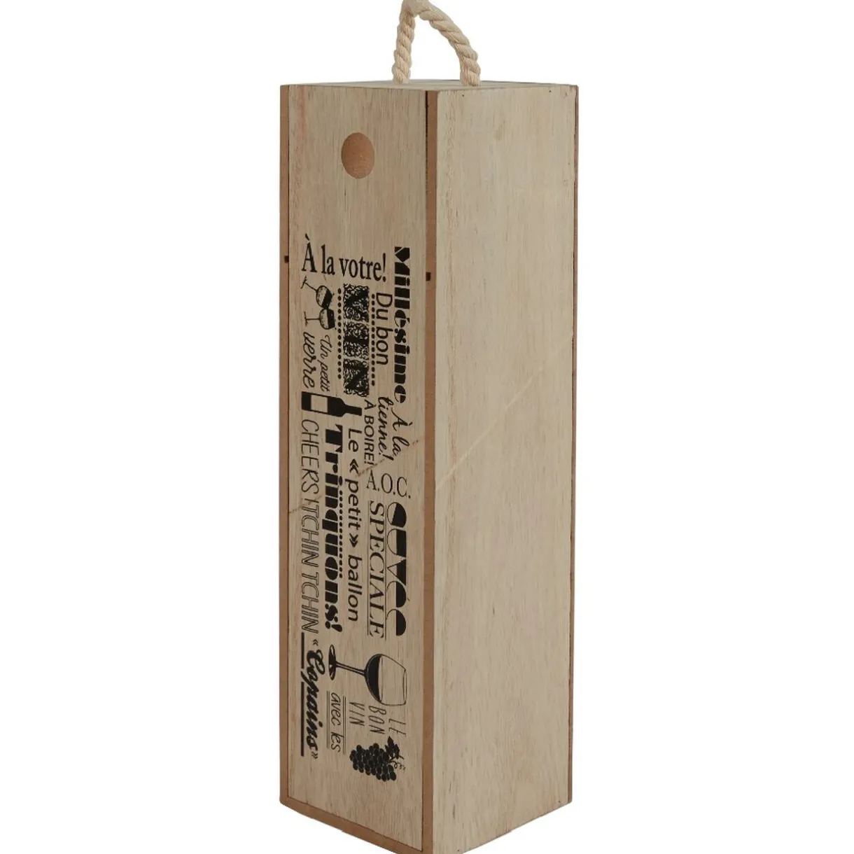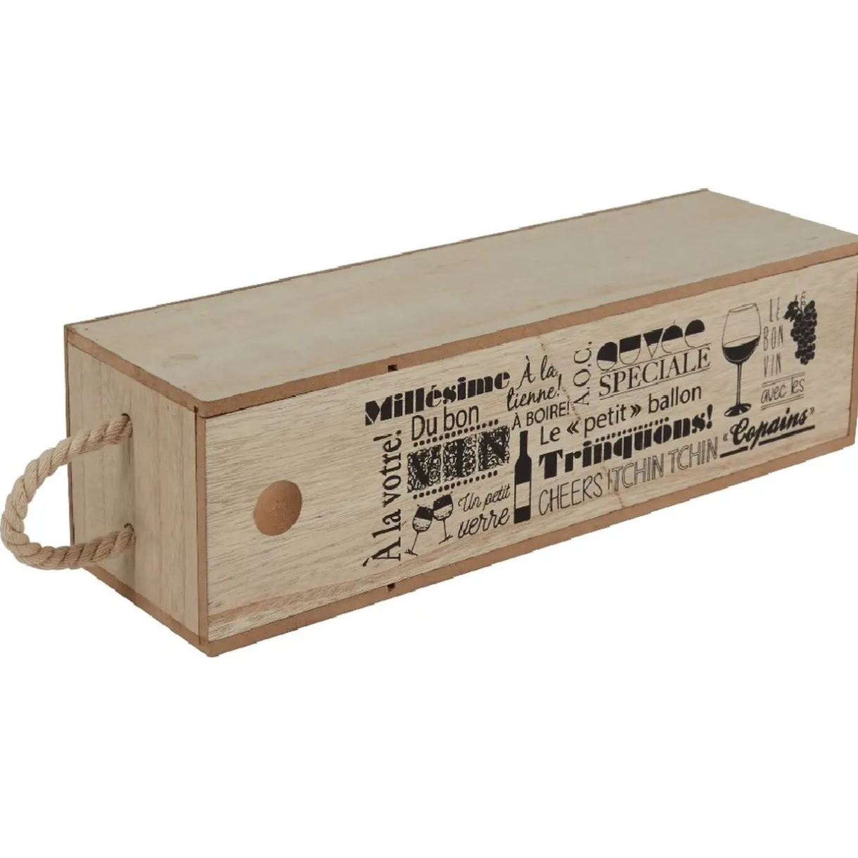 Caisse en bois pour bouteille de vin de couleur naturel et blanc avec inscription en noir.