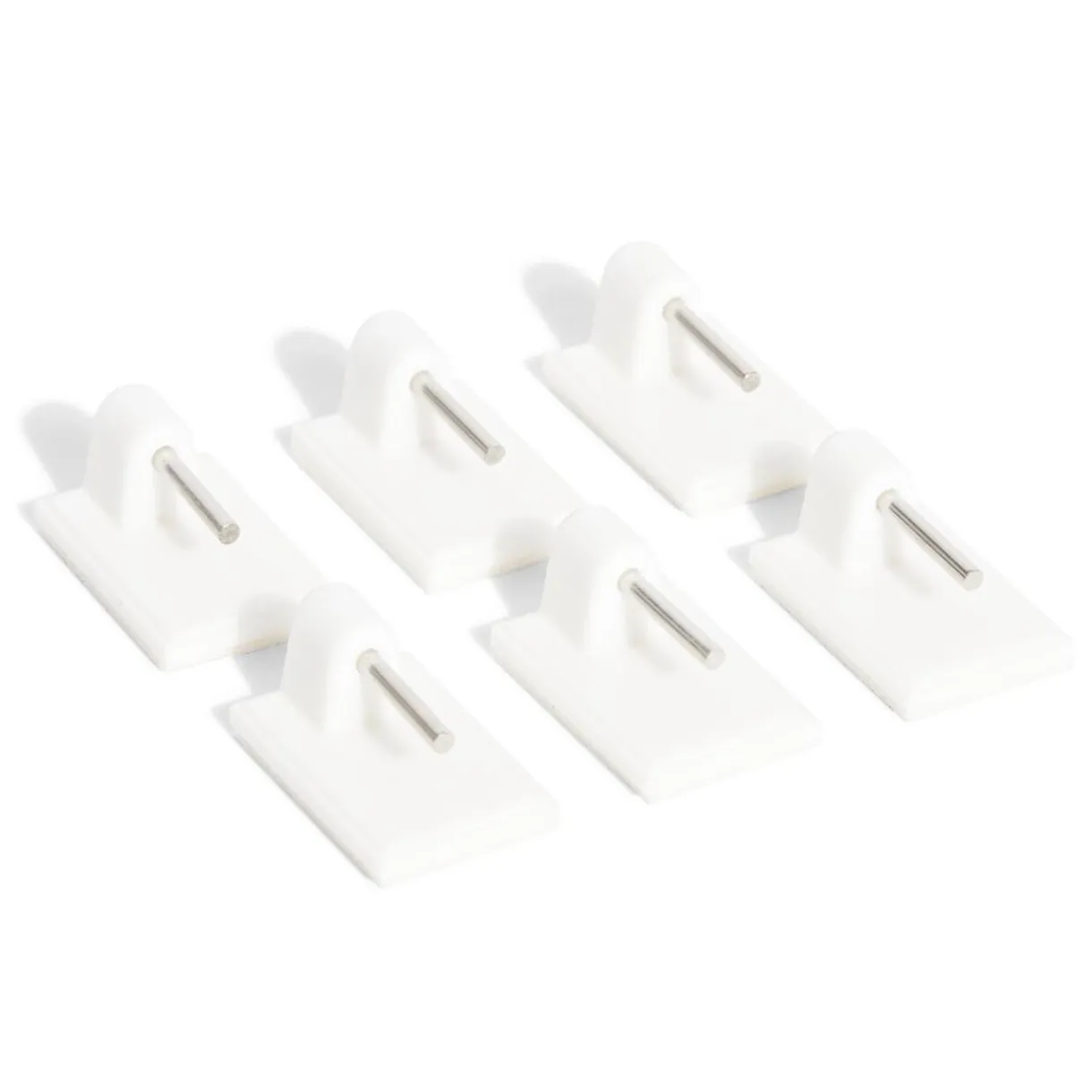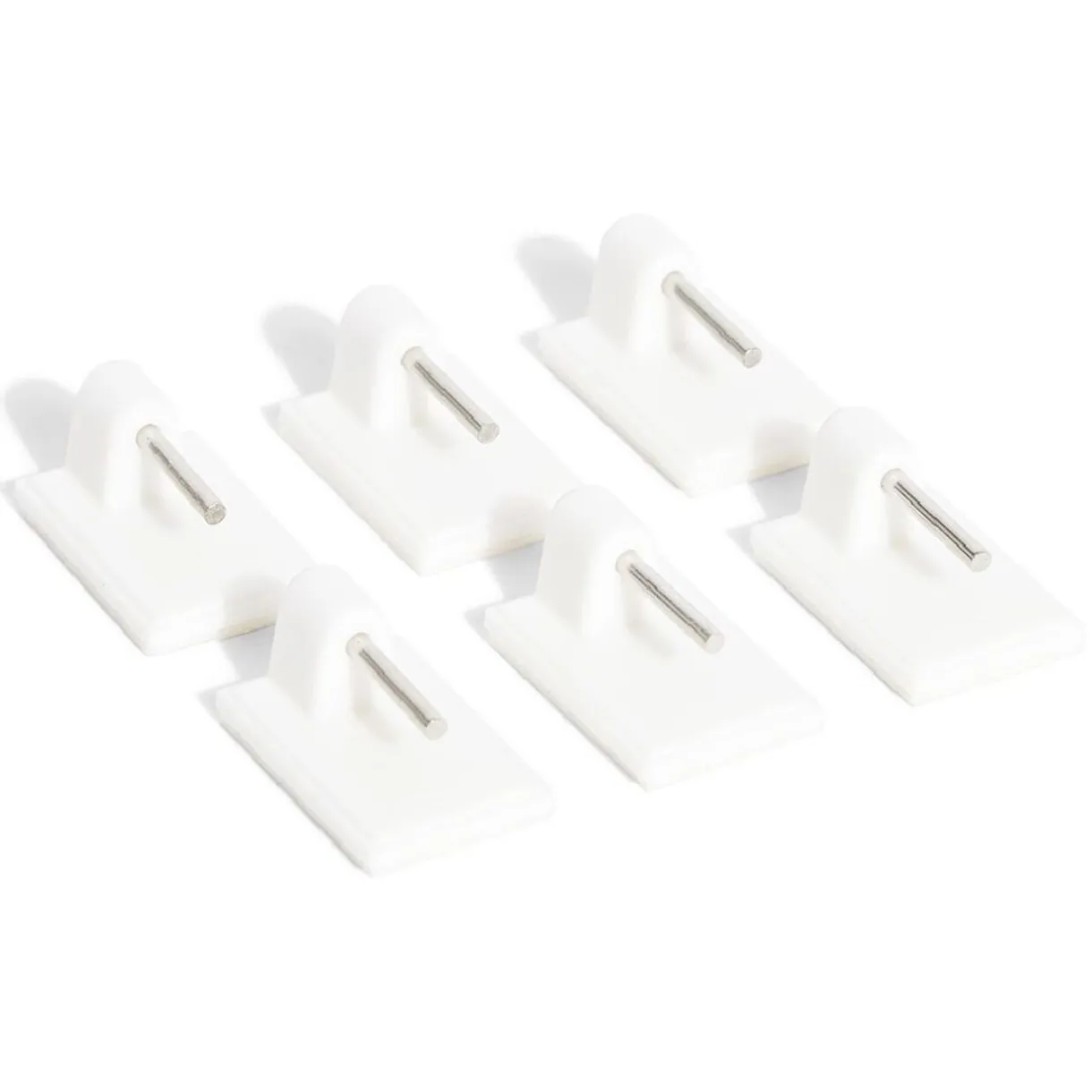 Lot de 6 crochets pour tringles en plastique blanc avec adhésif.