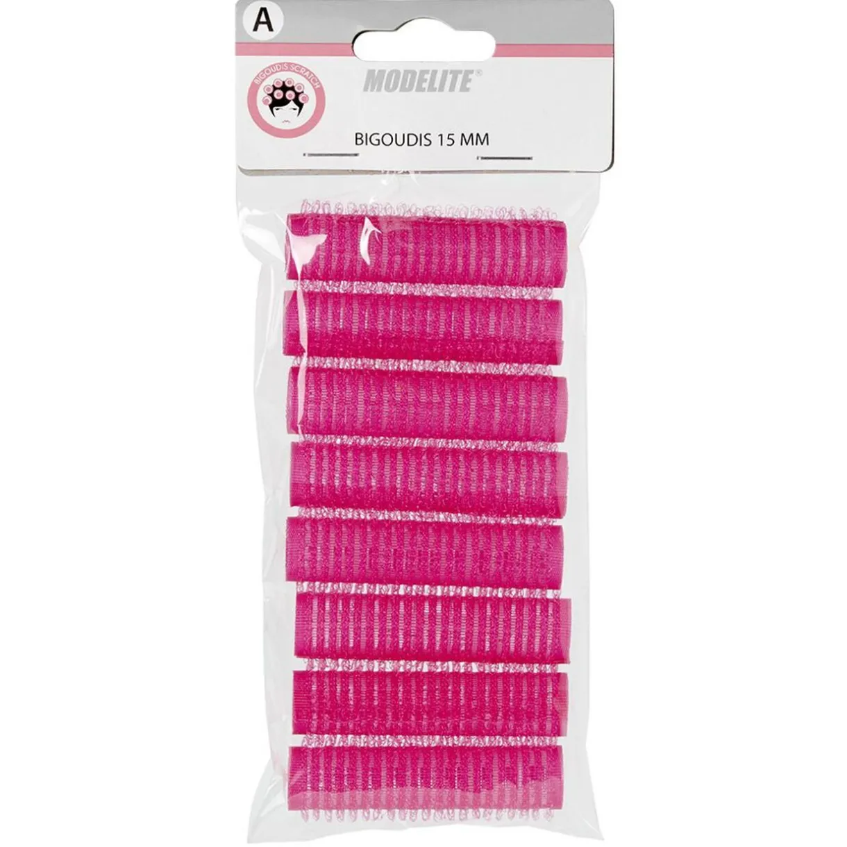 Lot de 8 bigoudis fuchsias à scratch autofixant. Longueur: 15 mm.