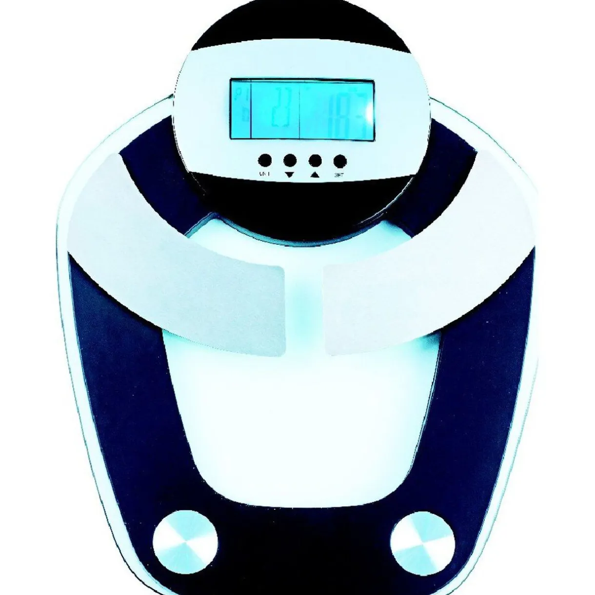 Pèse-personne, dim. 30,5×40,5 cm, verre et plastique. Ecran large lumineux, maximum 150 kgs, analyseur de graisse corporelle. Fonctionne avec 3 piles LR03 / AAA..