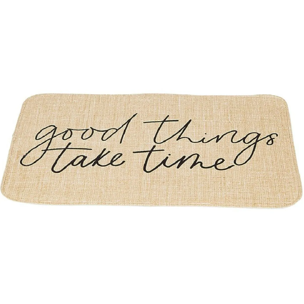 Le tapis de salle de bain existe en 4 différents modèles, selon disponibilité : blanc, marbré, zig-zag noir et blanc ou « good things take time ».