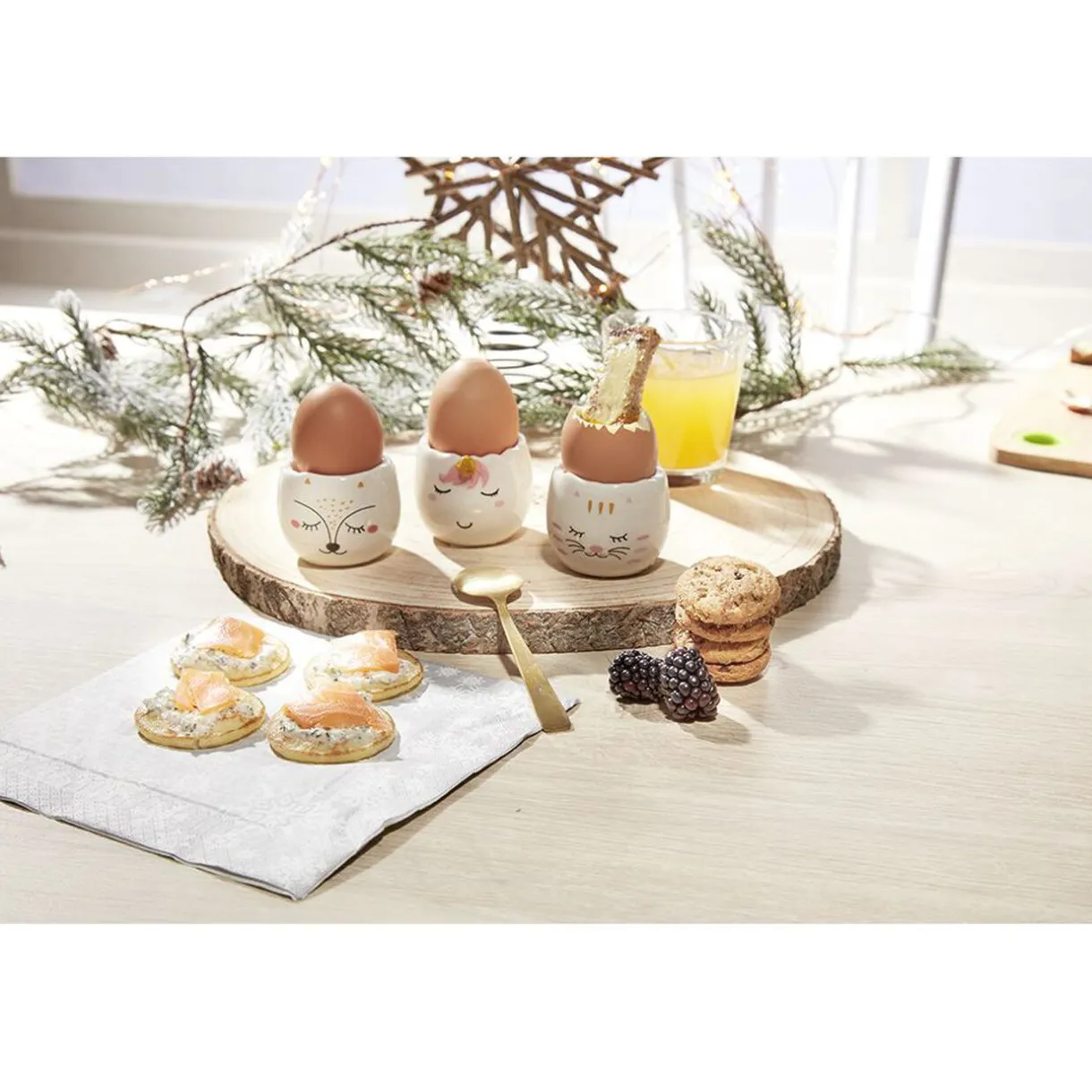 Coffret composé de 3 coquetiers avec rebord en relief design tête de chat, renard et licorne.