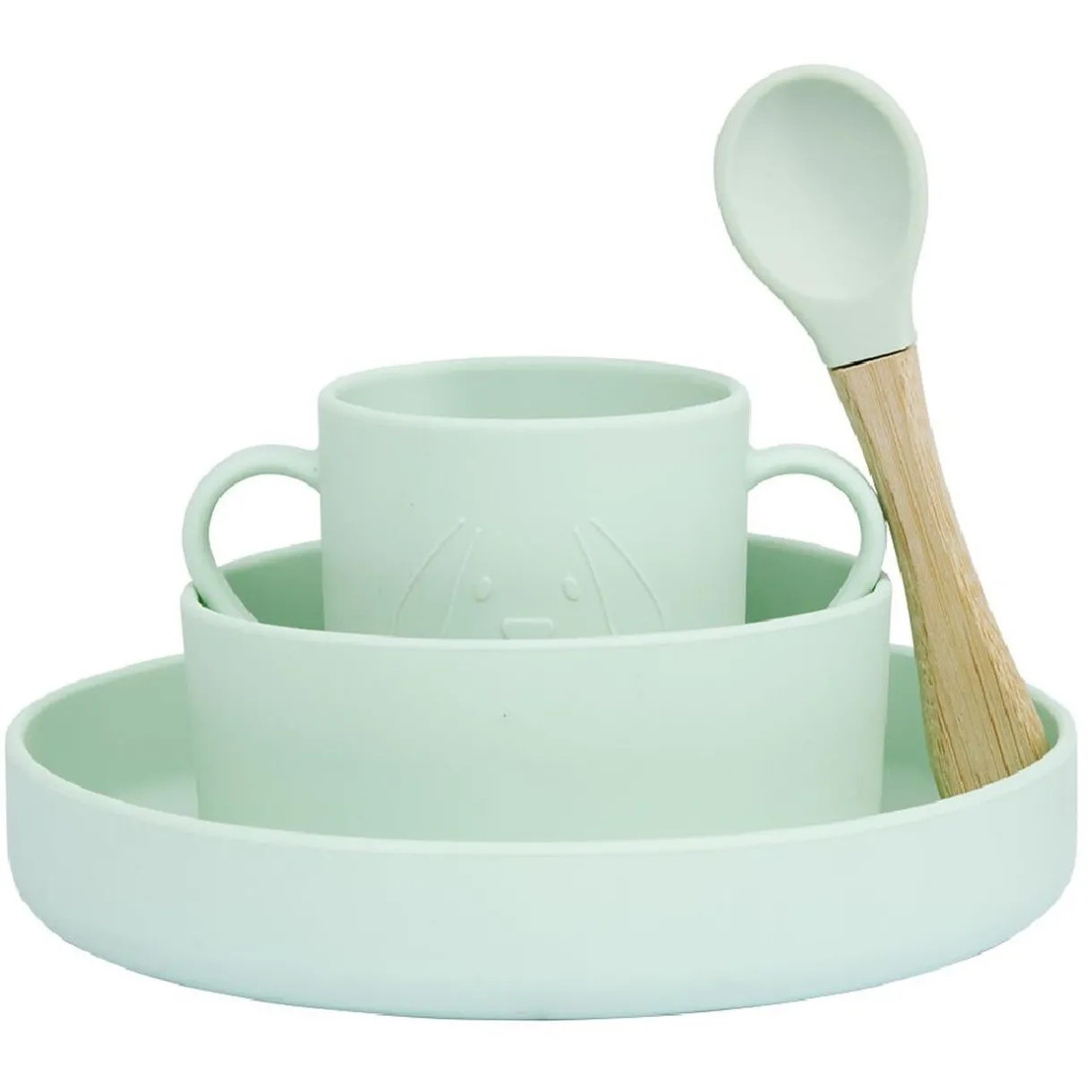Coffret repas pour bébé comprenant 1 assiette Ø18 cm, 1 bol Ø11,5 cm, 1 tasse Ø8 x H.12 cm et 1 petite cuillère en bambou.