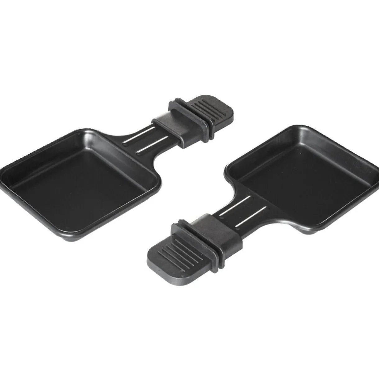 Set de deux coupelles à raclette de forme carrée en aluminium avec revêtement antiadhésif.