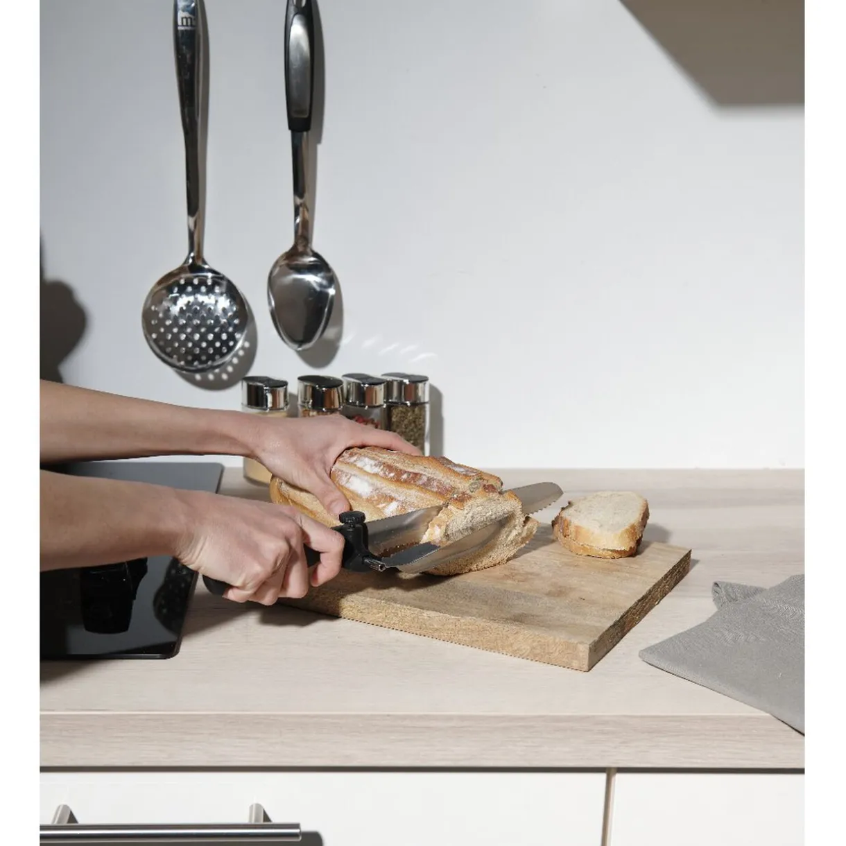 Couteau à trancher réglable en inox qui permet de couper des tranches minces ou plus épaisses proprement et uniformément.