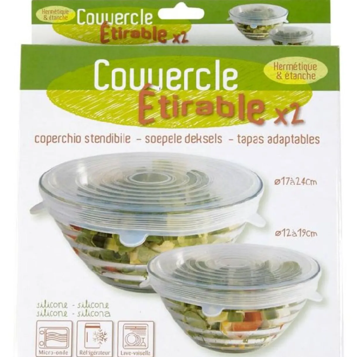 Ces deux couvercles rendent vos récipients parfaitement hermétiques et étanches. Les couvercles sont incroyablement élastiques et s’étirent pour s’adapter à un maximum de récipients de toutes tailles et de toutes formes. D’un diamètre de 12 et 17 cm, fabriqués en silicone, ces couvercles vous garantiront une résistance à toute épreuve. Lavables, ils sont réutilisables à l’infini. Idéaux pour le réfrigérateur, le congélateur, le Micro-ondes mais aussi pour le transport sans avoir peur d’en perdre la moindre goutte.
