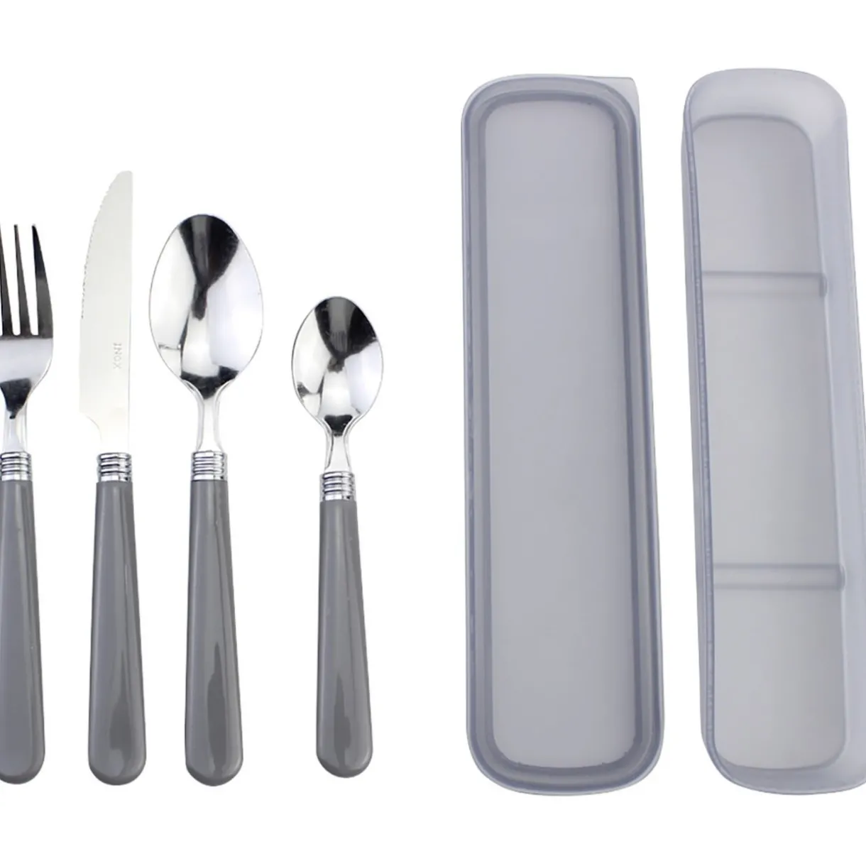 Parfait pour le camping, pique-nique ou bureau, cette boîte munie de ses 4 couverts gris en inox vous permet de prendre vos repas en extérieur avec vos propres couverts réutilisables.