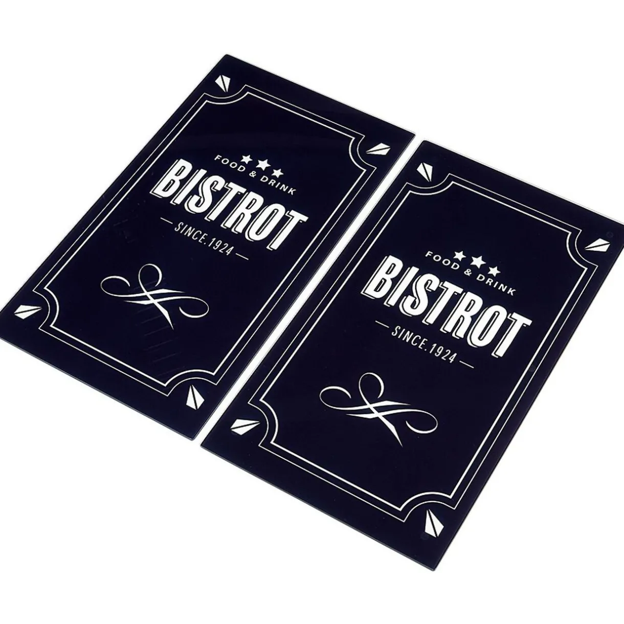 Ce lot de 2 planches à découper en verre noir design bistrot recouvrira parfaitement votre plaque vitrocéramique ou à induction. Esthétiques et protectrices, leur design en verre d’inspiration rétro apportera une belle touche déco à votre cuisine.