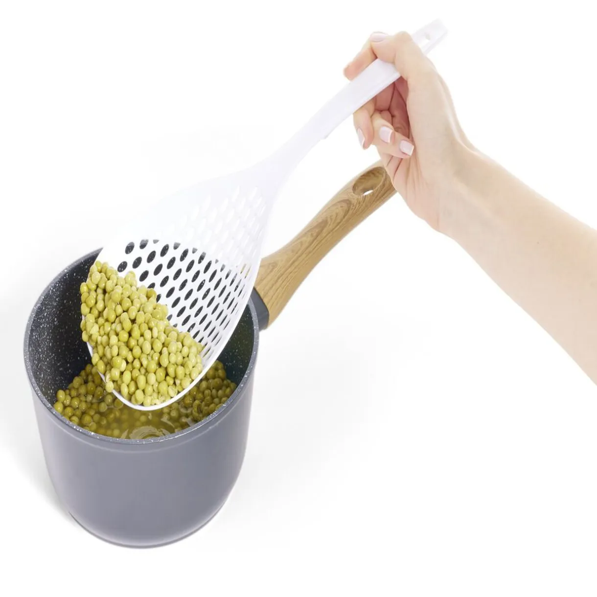 Cette cuillère écumoire en plastique est un outil de cuisine pratique et indispensable.