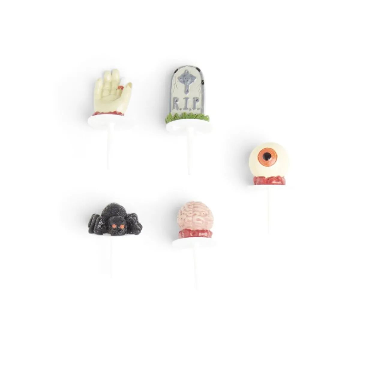 Décorez vos gâteaux à l’occasion d’Halloween avec ce lot de 5 décorations en résine comprenant différentes formes telles que cervelle, oeil , main coupée etc.