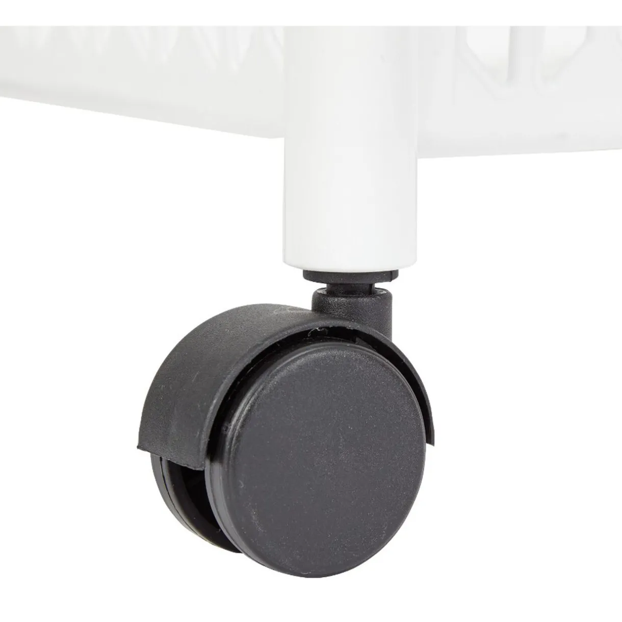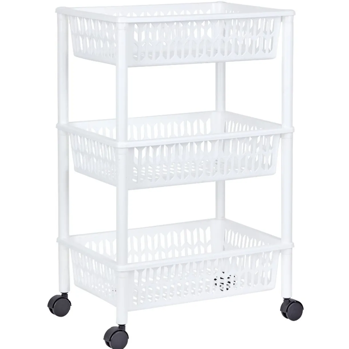 Desserte de cuisine sur 3 niveaux avec panières blanches.