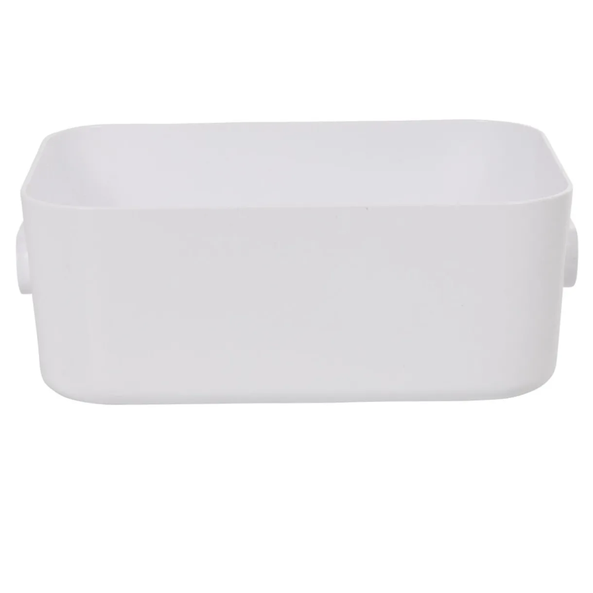 Boîte de rangement blanche pour salle de bain de petite taille.