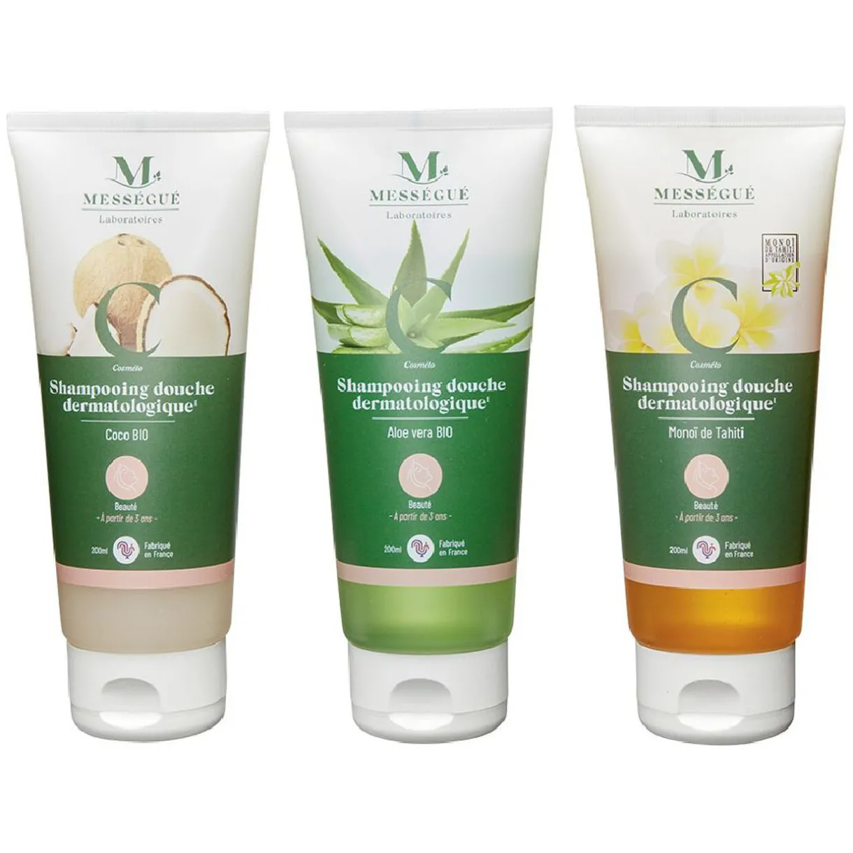 Coffret de 3 shampoings-douche Instant évasion de Mességué en flacon pompe de 200 ml.