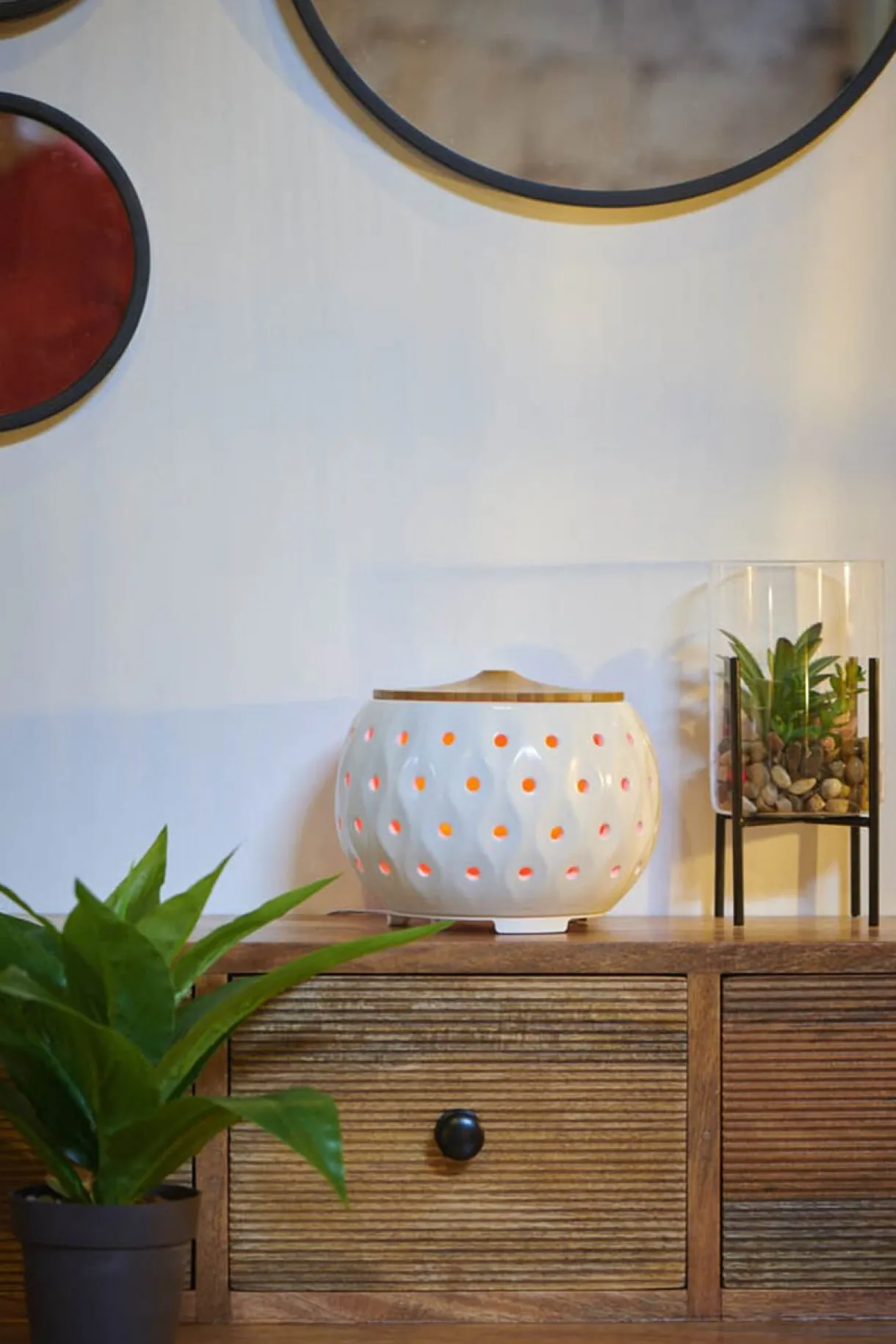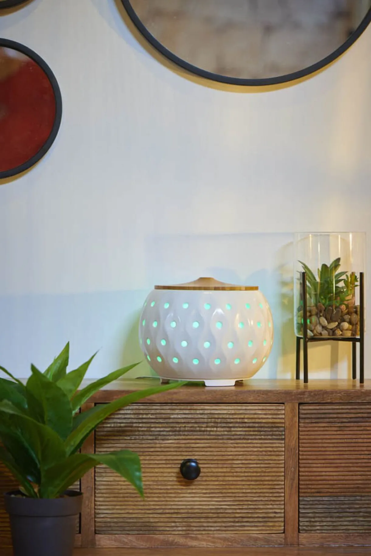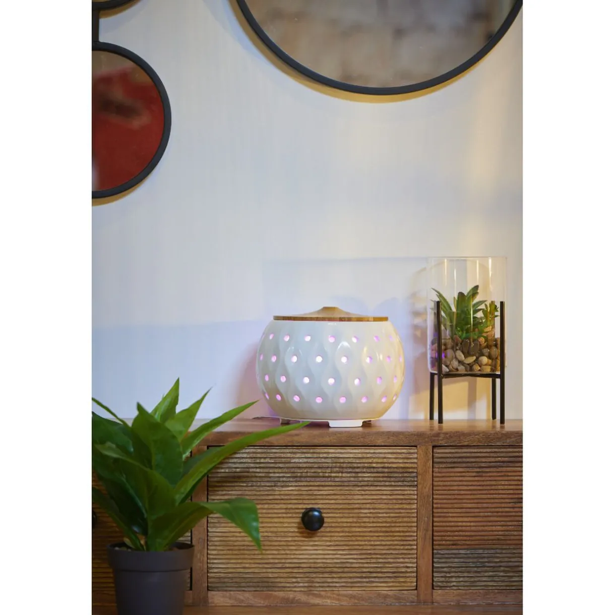 Diffuseur d’huiles essentielles ultrasonique Mességué. Avec une contenance de 200 ml, de forme ronde en céramique avec couvercle en bois, il vous offrira une longue et agréable diffusion tout en apportant une touche zen à votre intérieur. De plus, son design lumineux qui change de couleurs jusqu’à 4 différentes apportera de la couleur et de l’originalité à votre déco.