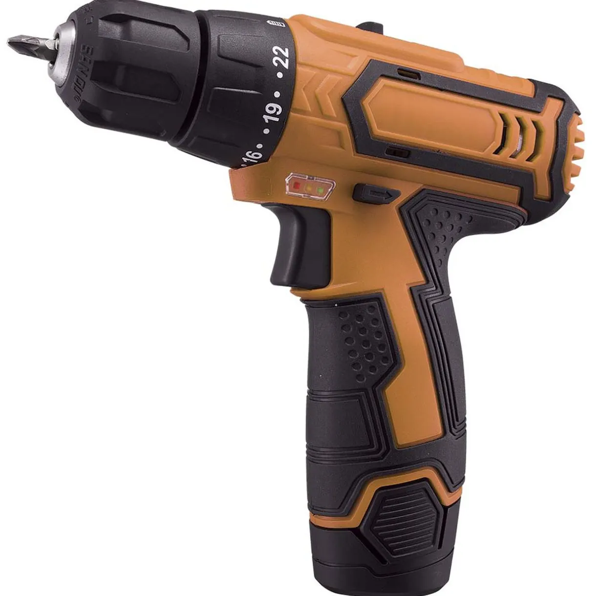 Percez, vissez et dévissez facilement grâce à cette perceuse visseuse électrique Profilex orange et noire avec 17 embouts.