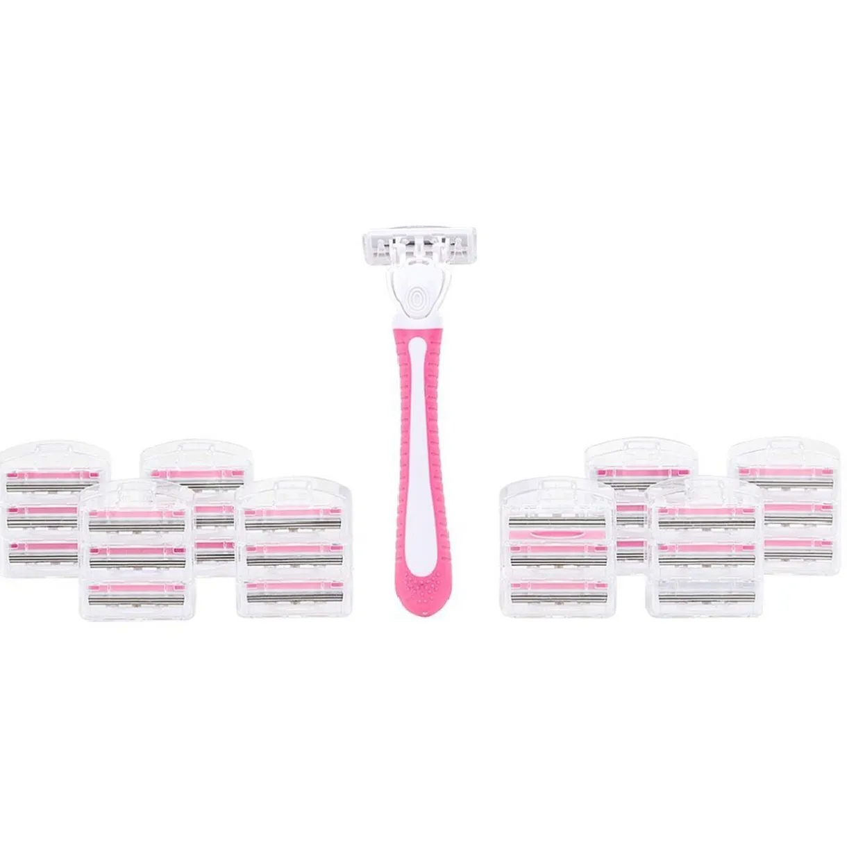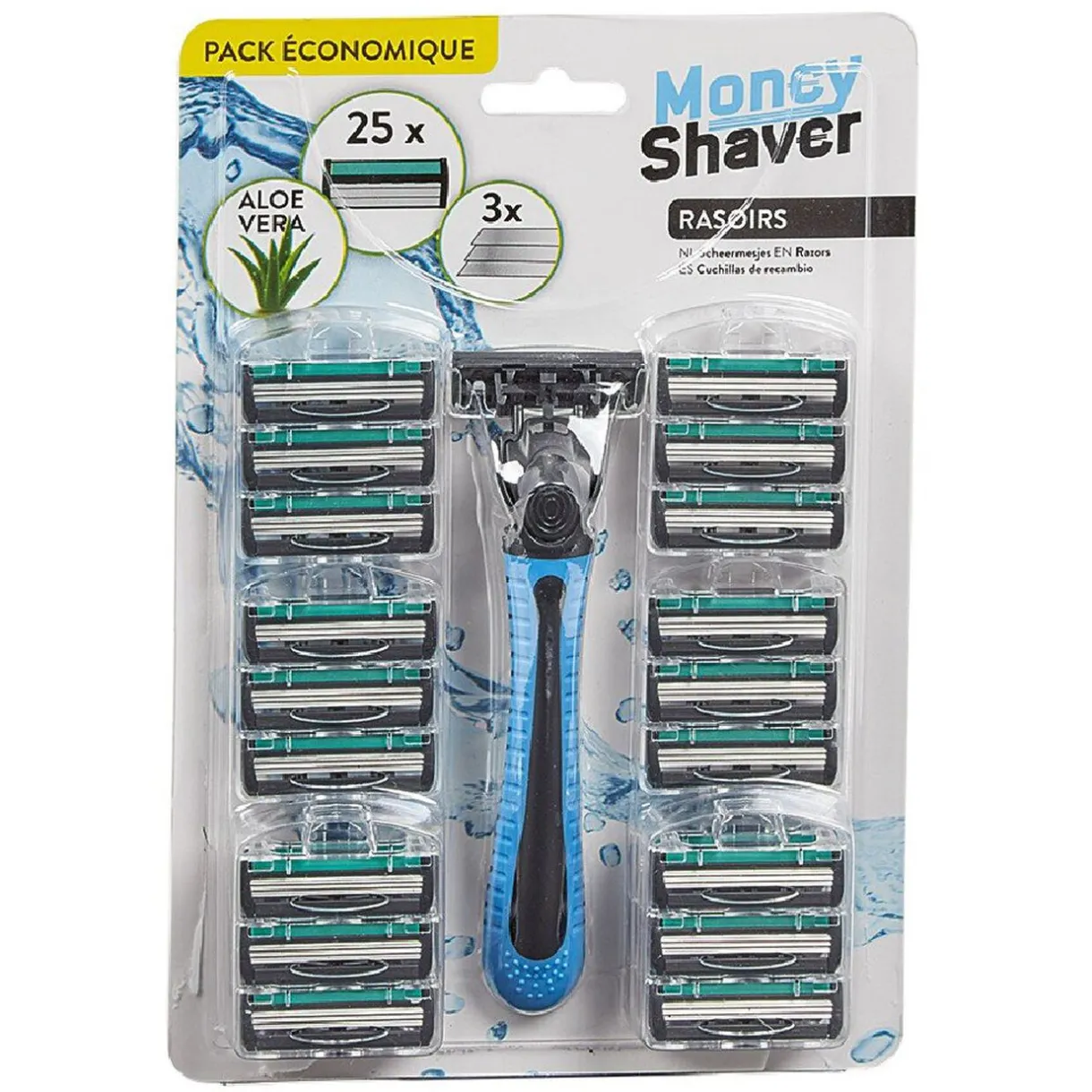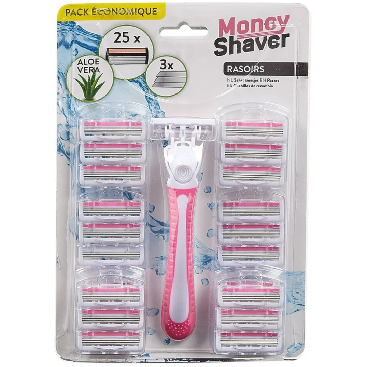Le rasoir existe en rose ou en bleu, selon disponibilité.