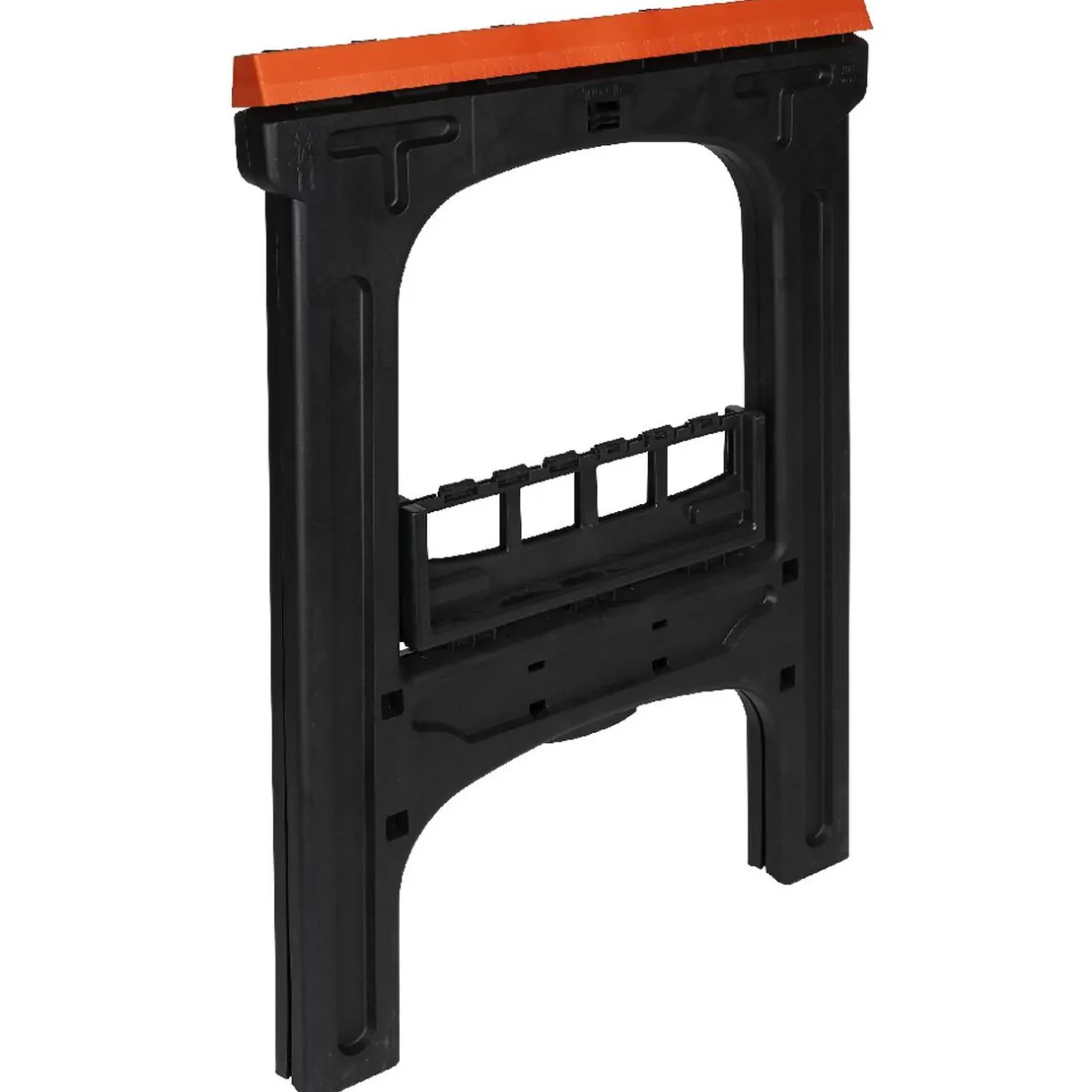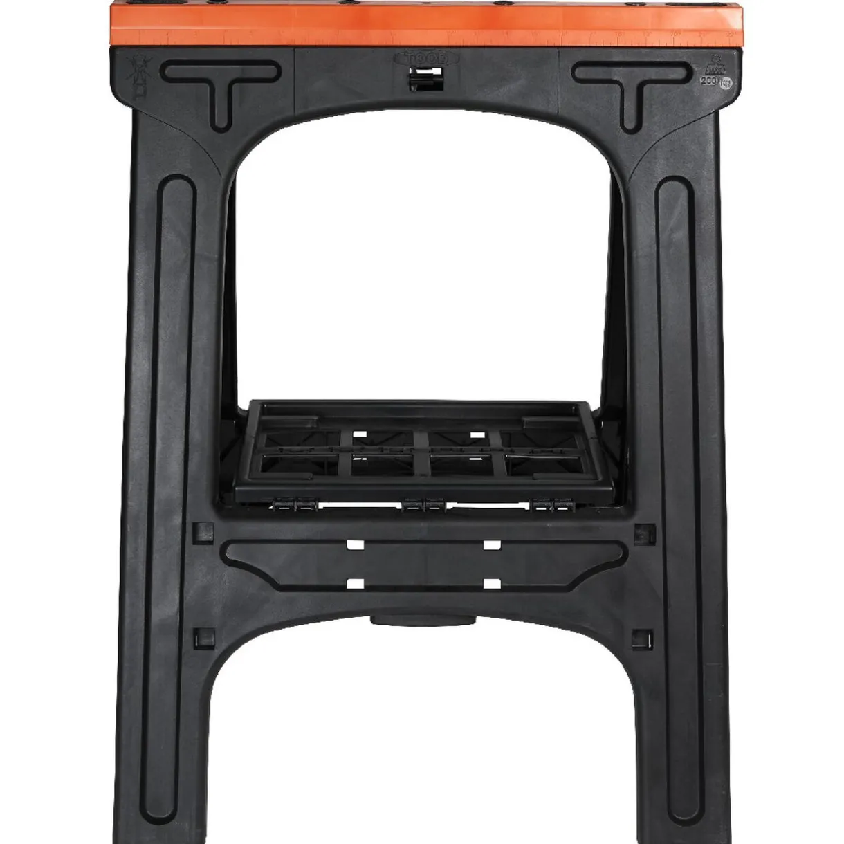 2 tréteaux pliants, poids maximum 200 kg par tréteau. Épaulement gradué, butoir à bascule, tablette centrale porte-outils, crochet mural et de jonction.