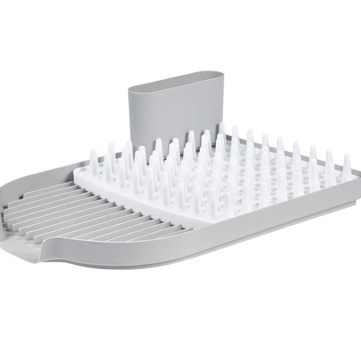 Égouttoir gris avec plateau blanc à picots et bac à couverts, tous deux amovibles.