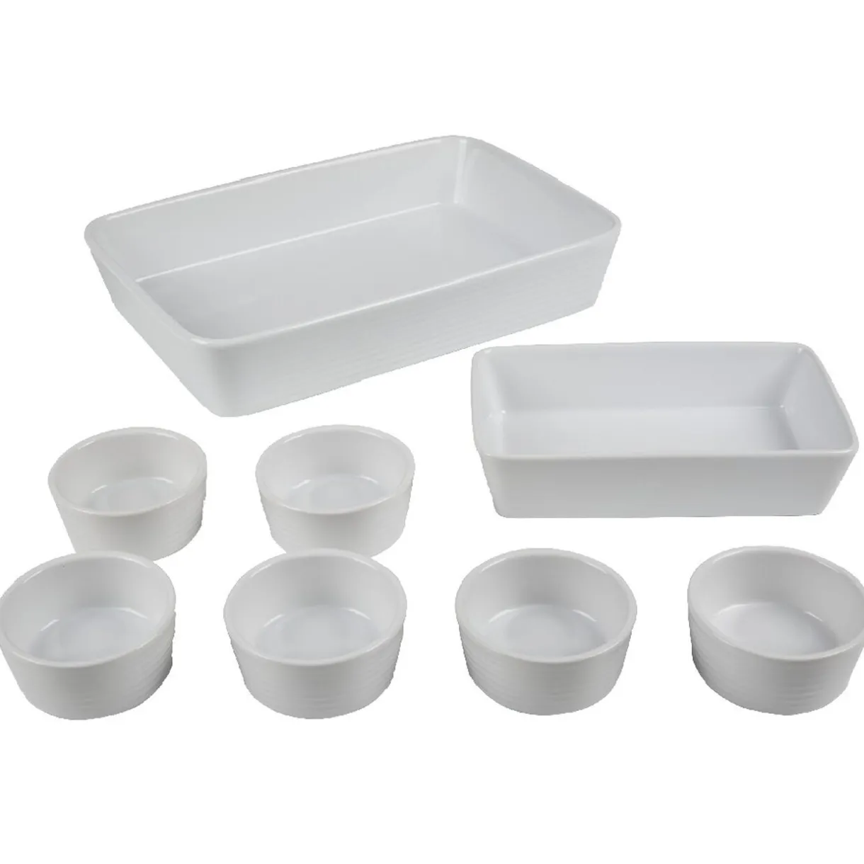 2 plats à four, un petit et un grand avec 6 ramequins, le tout empilable.