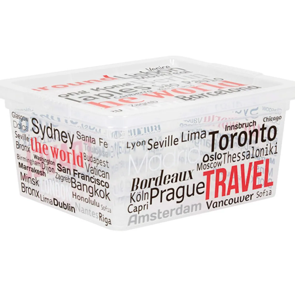 Boîte de rangement avec couvercle design noms de villes 2 L, dim. 19,5×16,5×9,5 cm, plastique.