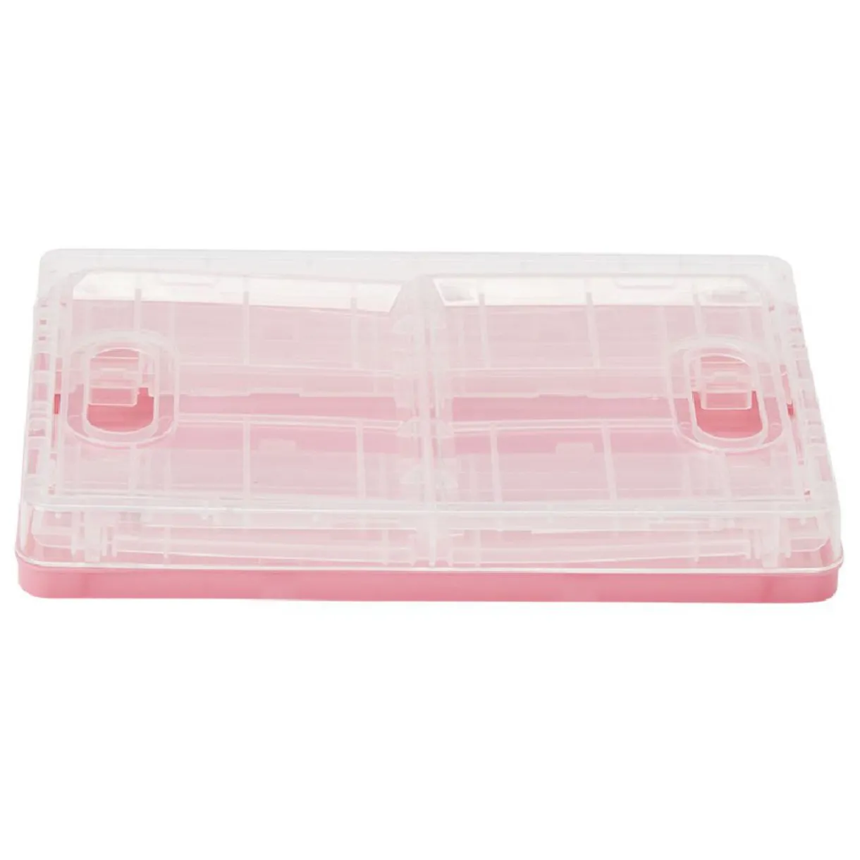 Boîte de rangement alpina rectangulaire transparente et bleue, rose ou verte.